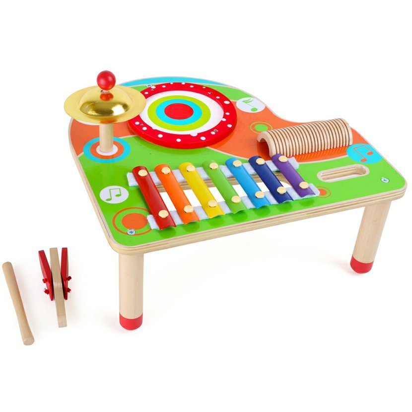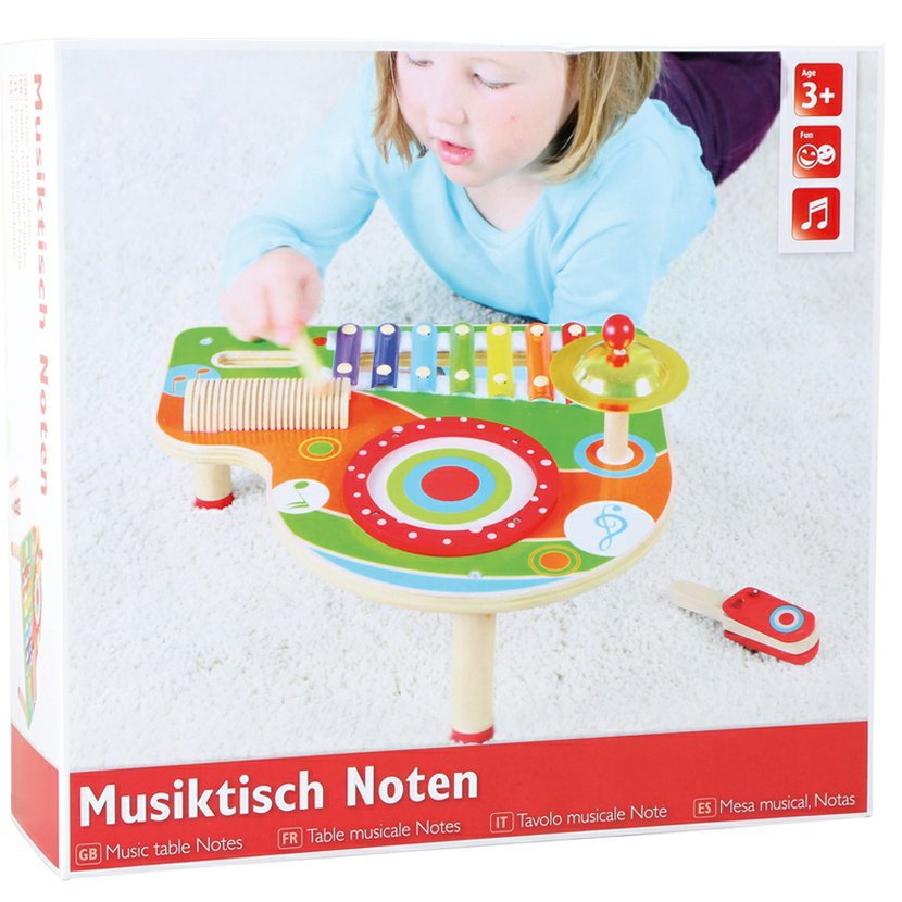 Tento hudební stůl vyrobený ze dřeva je ideální pro mladé hudebníky. Xylofon s barevnými tóny, řehtačka, činely a bubínek přinesou s dřevěnými paličkami hudební zážitek. Dřevěný stůl stojí na třech nohách, a proto je velmi stabilní.