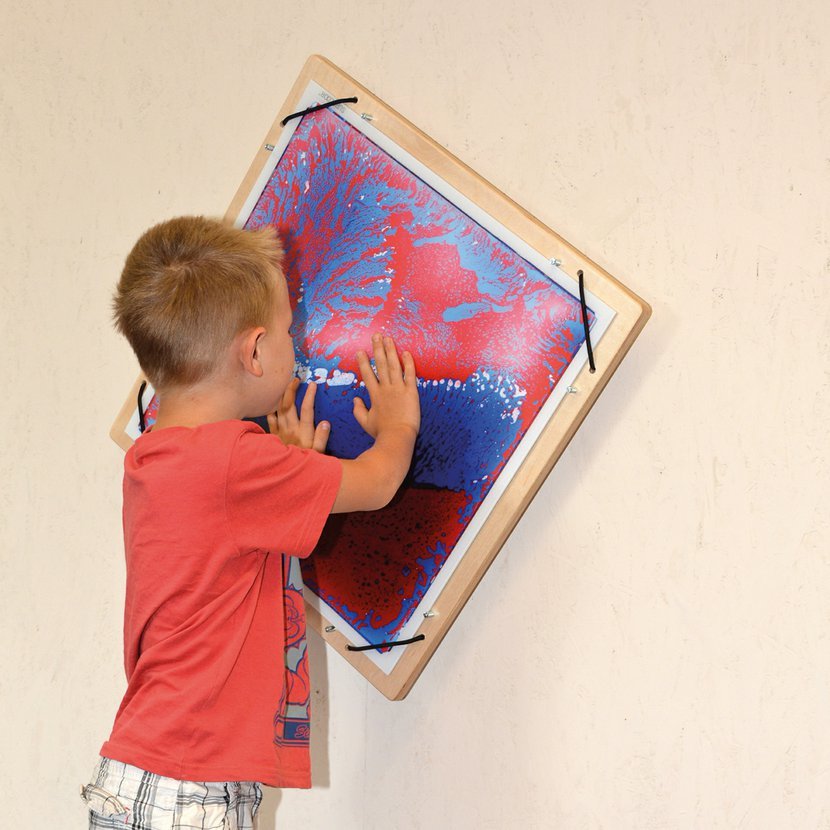 Aby děti mohly obdivovat úžasný svět barev a prolínání tekutin nejen při chození po podložce na podlaze, ale i jiným způsobem, poslouží vám k pozorování tento otočný panel, který se upevní jednoduše na zeď. Gravitace zapříčiní samovolné prolínání barev. Otáčením panelu a dotýkáním se připevněné podložky vznikají stále nové a nové variace barev.