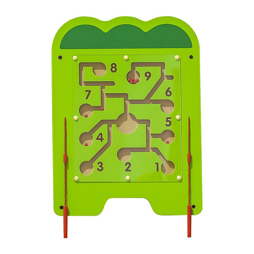 Magnetický labyrint: Další panel obsahuje magnetický labyrint se dvěma magnetickými tužkami na pohyb kuliček. To umožňuje dětem trénovat efektivitu obou rukou současně a také se učit čísla a jejich pořadí. Vše je zakryto plexisklem.