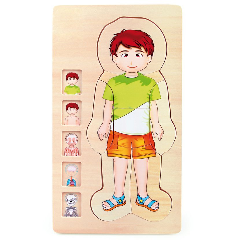 Jak vypadá lidské tělo zevnitř? Zájem o lidské tělo a jeho funkce projevují již děti v mateřských školách. Poznávejte lidské tělo od jeho kostry, svalů, krevního oběhu, vnitřních orgánů a postupně po jednotlivých vrstvách jej sestavte. Lidské tělo je zde zobrazeno v pěti vrstvách od lidské kostry až k oblečenému dítěti. Každá vrstva se skládá ze sedmi dílů. Jednotlivé vrstvy jsou zpracovány velmi detailně. Při skládání jednotlivých dílů si děti zároveň procvičují svojí manuální zručnost.