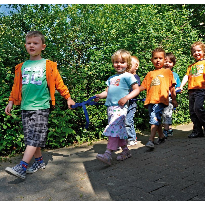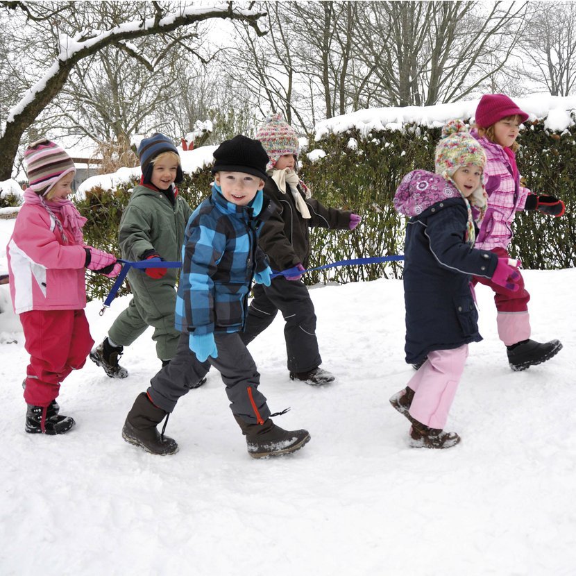 Pro větší bezpečnost a klid při pohybu venku. Šest samostatných rukojetí je připojeno k hlavnímu popruhu tak, aby mohly jít děti ve dvojicích za sebou. Proto nedochází k vytěsnění nebo ke zbytečným zmatkům. Vodítko má karabinu na jednom konci a na druhém konci kovový kroužek, proto je možné jej rozšířit na libovolnou délku.