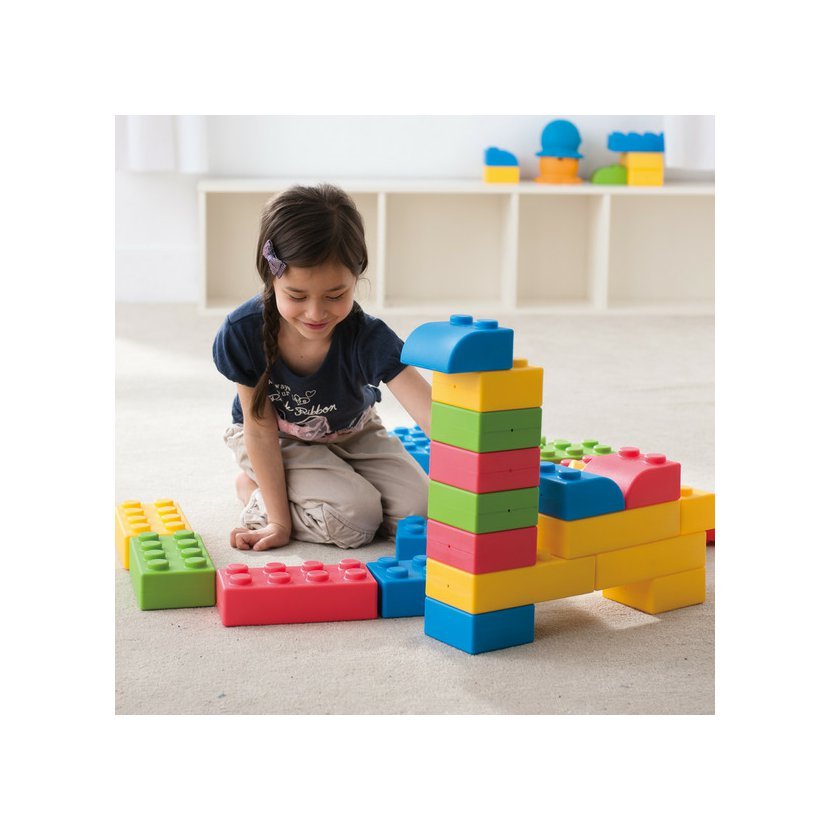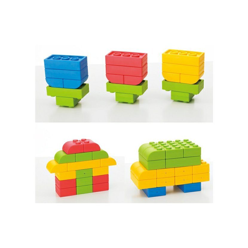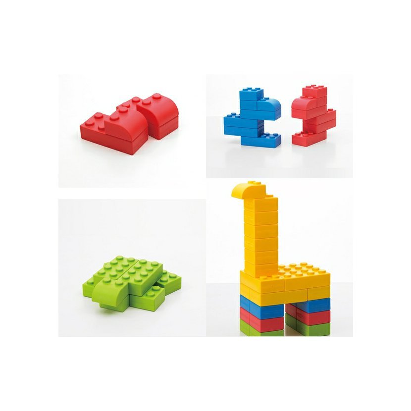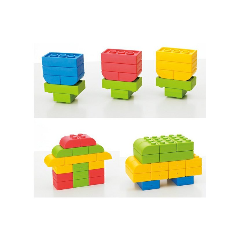 Konstrukční díly různých geometrických tvarů vytváří nesčetné možnosti pro stavbu. Podporuje rozvoj představivosti a kreativity. Jednoduše se skládá dohromady. Zlepšuje koordinaci ruka-oko a rozvíjí pohyb. Vyrobeno z měkké gumy, lehké a bezpečné.