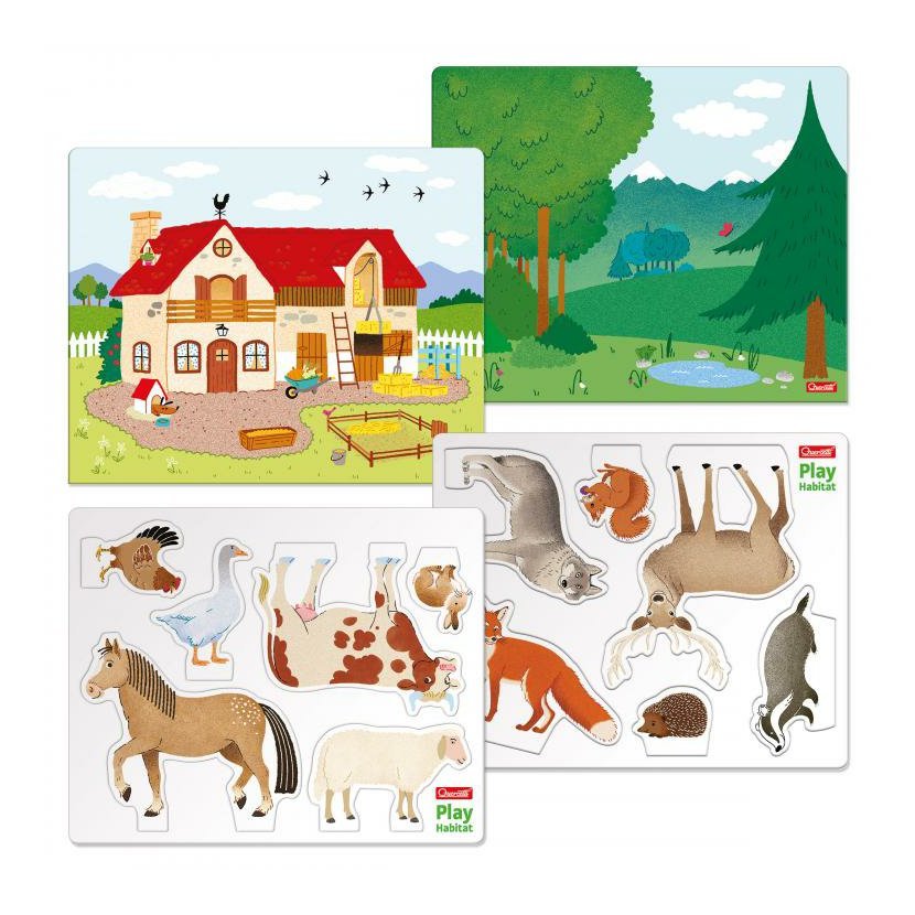 Upevni obrázek prostředí a rozestav zvířátka mezi kolíčky na podložce! Vytvořte zvířátkům to nejlepší prostředí pro život. Děti si mohou zvolit jeden ze dvou obrázků (statek nebo les) a oživit jej spoustou zvířátek. Obrázky pozadí i figurky zvířátek jsou vyrobeny z odolného masivního kartonu a mohou stát mezi kolíčky zasunutými do podložky, která je součástí balení. Zasouvací skládačka z nové řady Play Montessori pomáhá dětem od 3 do 6 let formou hry rozvíjet jejich poznávací schopnosti, smyslové vnímání i chápání souvislostí a vztahů. Při sestavování jednotlivých scenérií si děti zároveň procvičují a zdokonalují jemnou motoriku a prostorovou představivost. Obsah balení: 2 obrázky pozadí: statek a les6 domácích zvířátek6 lesních zvířátek5 prvků z prostředí statku a lesa6 ploch základny, 126 kolíčků1 příručka Play Montessori Hlavní vlastnosti: pomáhá rozvíjet poznávací schopnosti, smyslové vnímání i chápání souvislostí a vztahůzdokonaluje jemnou motoriku a prostorovou představivostvhodné pro děti od 3 do 6 let