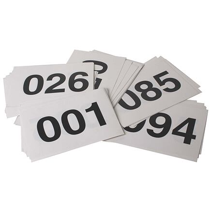 Černá startovní čísla (1-100) jsou vytištěna na bílém netrhacím papíře o rozměru 20 x 14cm. Čísla jsou třímístná a dostatečně velká, aby se dala jasně rozlišit.