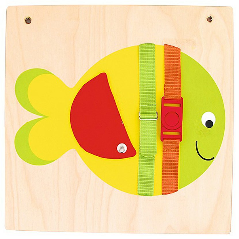 materiál: dřevo, látka, Rybička učí ovládání různých druhů zapínání oděvů a obuvi.