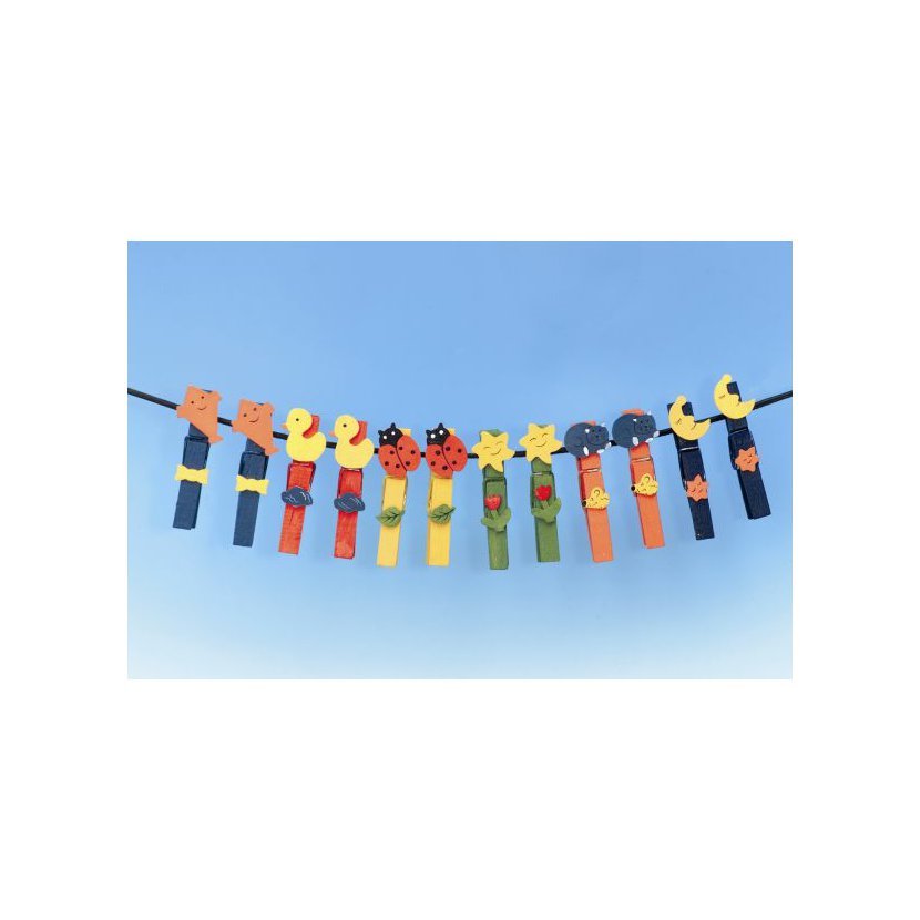 • obsah: 12 různobarevných dřevěných kolíčků s různými motivy
