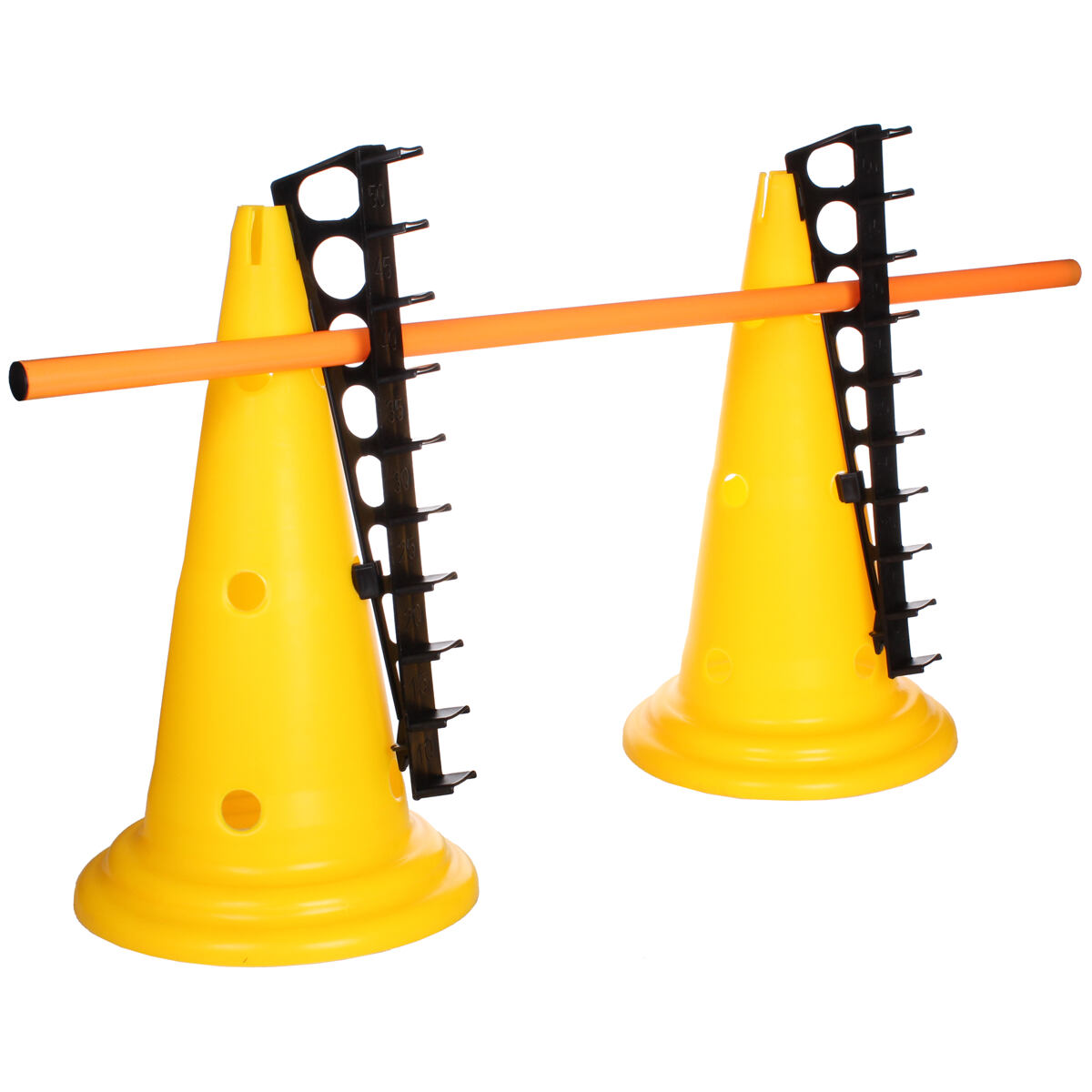 Sada na přeskoky 9 výškových pozic 10 - 50 cm Obsahuje: 2x kužel, celková výška 52 cm, průměr základny 30 cm 2x úchytky 1x tyč, délka 100 cm, průměr 2,5 cm Materiál: plast