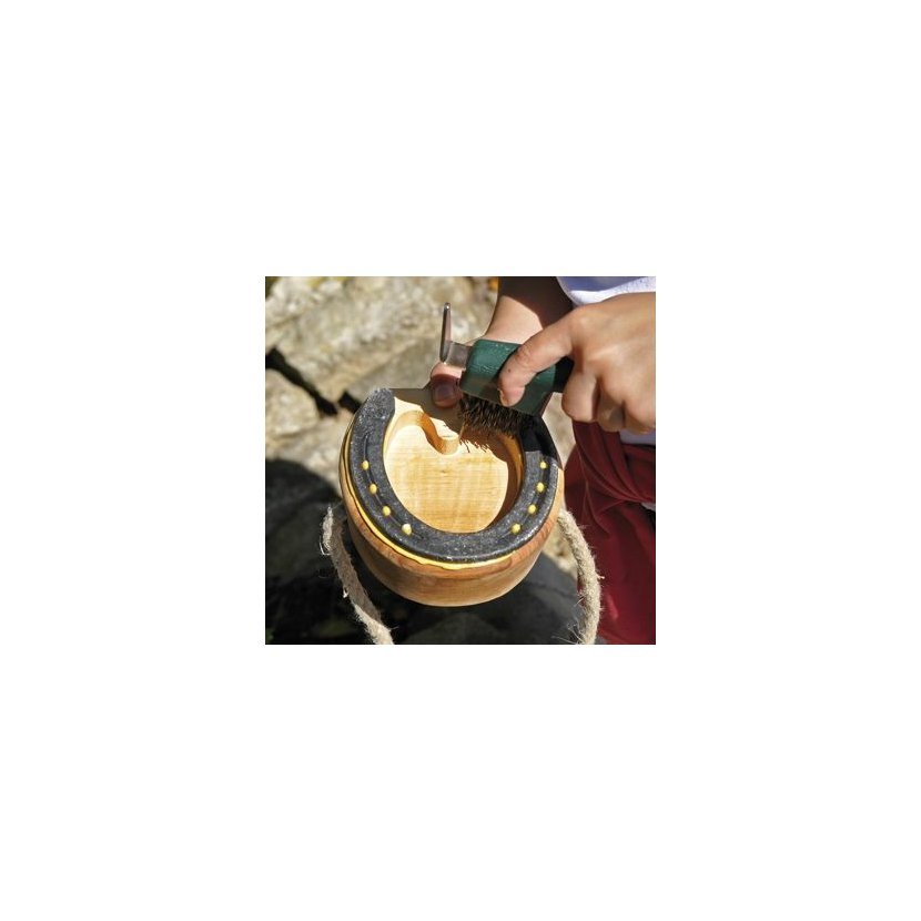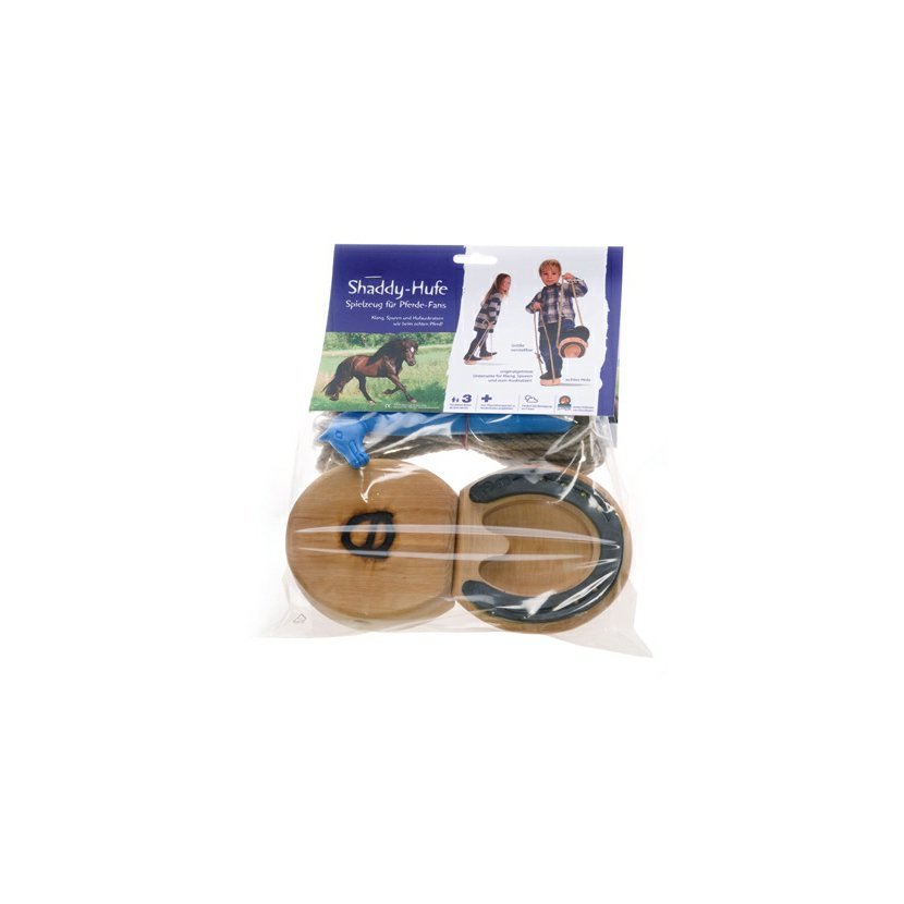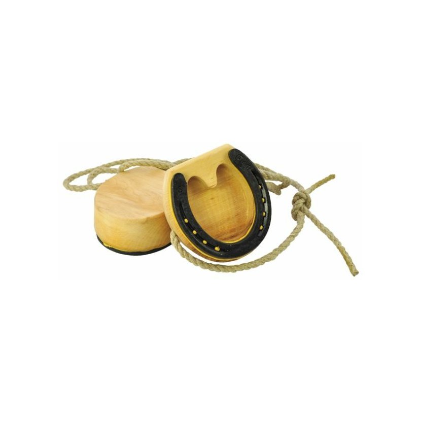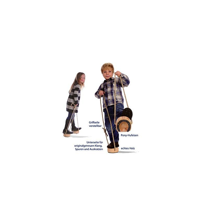 Přírodní materiál, pravá podkova. Tyto podkovy jsou z masivního dřeva a pravých podkov téměř nezničitelné. Zvuk podkov a stopy vypadají jako od skutečného koně. Po vyjížďce je možno podkovy vyčistit “škrabákem“ – háčkem. Podporuje pohyb v přírodě, procvičuje rovnováhu a koordinaci. Nastavitelné úchopy. Výrobek získal ocenění "Správná hračka".