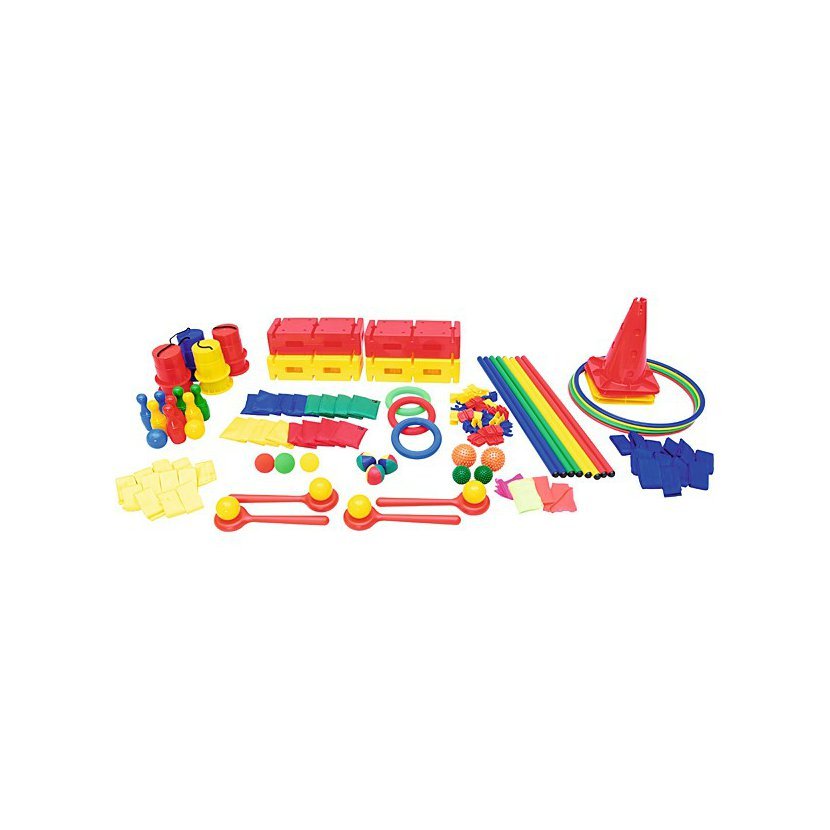 Sada 67 ks různého sportovního náčiní, pro uskladnění ve vozíku na sportovní náčiní (H2100039). • H2604043 Měkké Žonglérské míčky 3 ks • H2144070 Kuželky 1 sada • H2077001 Molitanové míčky prům. 7 cm, 3 ks • H2522010 Masážní míčky 2 ks • H2550030 Ringo kroužky 3 ks • H2610064 Taneční šátky L 4 ks • H2500057 Smart lžíce 4 ks •H2500045 Pytlíky s hrachem 16 ks • H2550011 Mini chůdy 4 páry • H2550018 Žluté šerpy 12 ks • H2550019 Modré šerpy 12 ks •H2522042 Míček s bodlinami 2 ks •H2500126 Gymnastická sada 1 ks