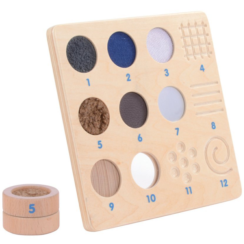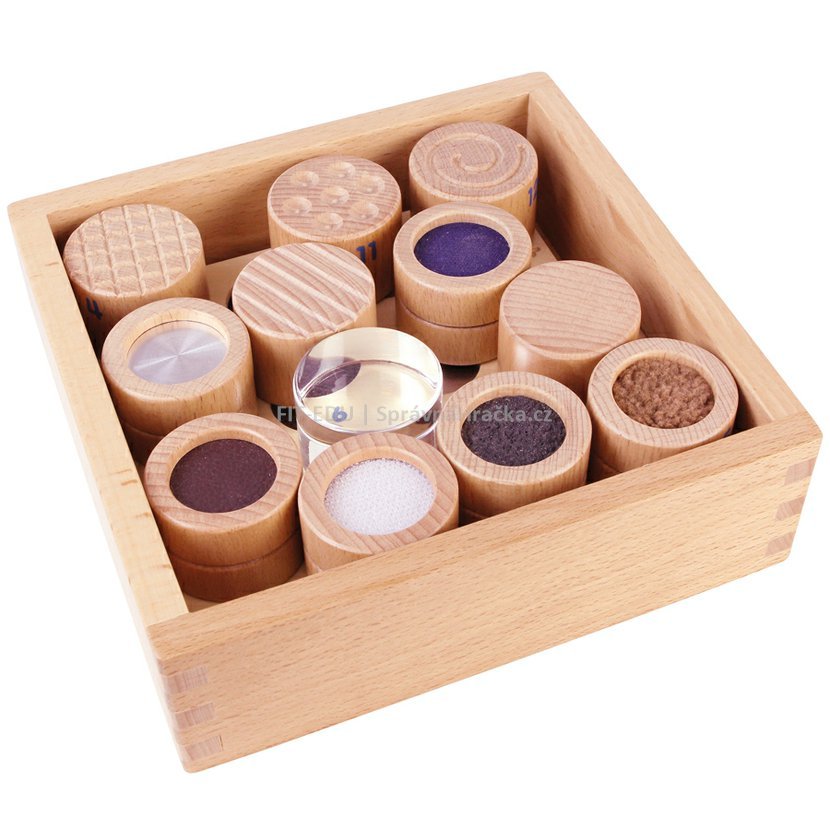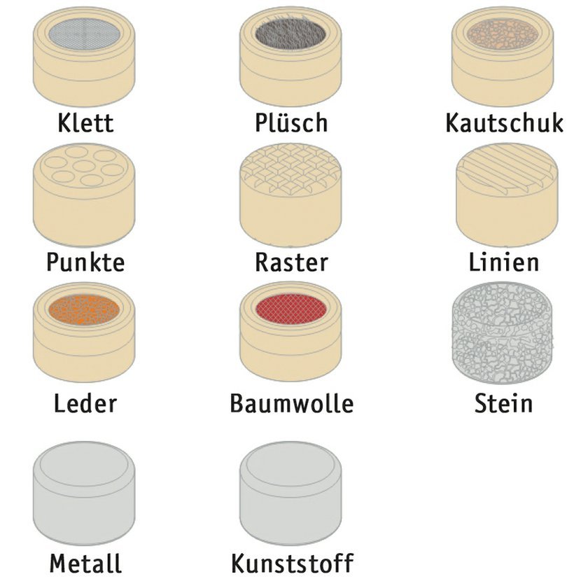 Na 12ti válečcích jsou na horní a spodní straně zabudovány různé materiály, resp. povrchové struktury. Dotýkání se jednotlivých materiálů podporuje hmatovou činnost a procvičuje popisování povrchů, tím u dětí rozšiřuje slovní zásobu a komunikaci. Druhé dítě se snaží na základě vzorové tabulky rozpoznat, o jaký materiál a strukturu se jedná.