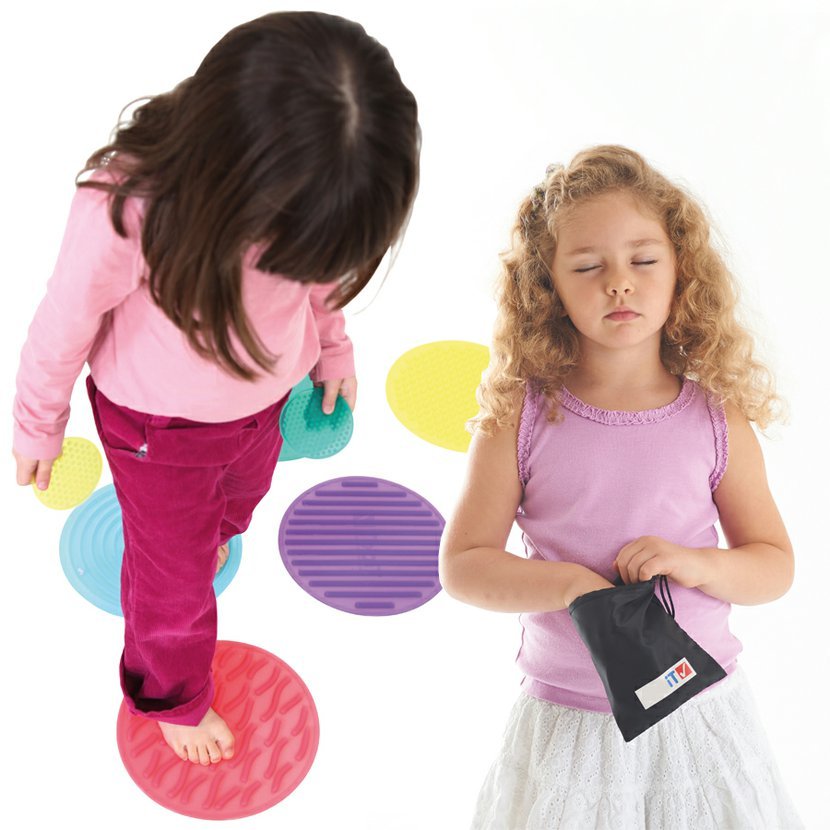 Kulaté, proužkované, puntíkované... se zavřenýma nebo zavázanýma očima si děti vyndavají z pytlíčku malá silikonová kolečka. Poté co odhalí svými prsty strukturu povrchu, zkouší najít pomocí hmatu na chodidlech stejnou strukturu u velkých silikonových podložek. Po otevření očí se dítě dozví (dle struktury a barvy), zda jeho volba byla správná.