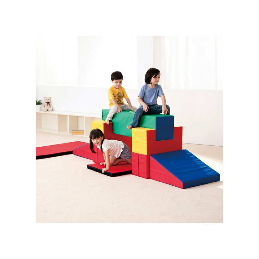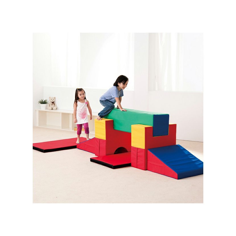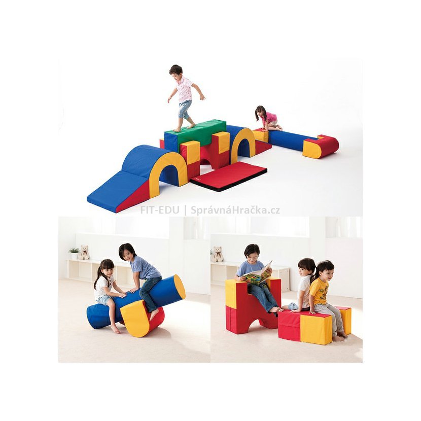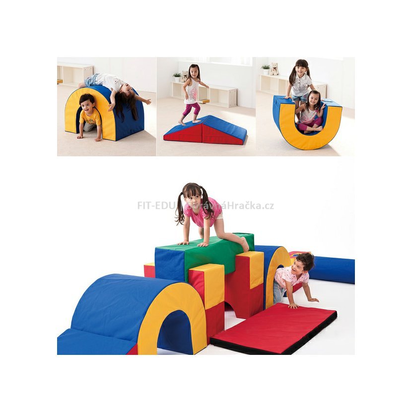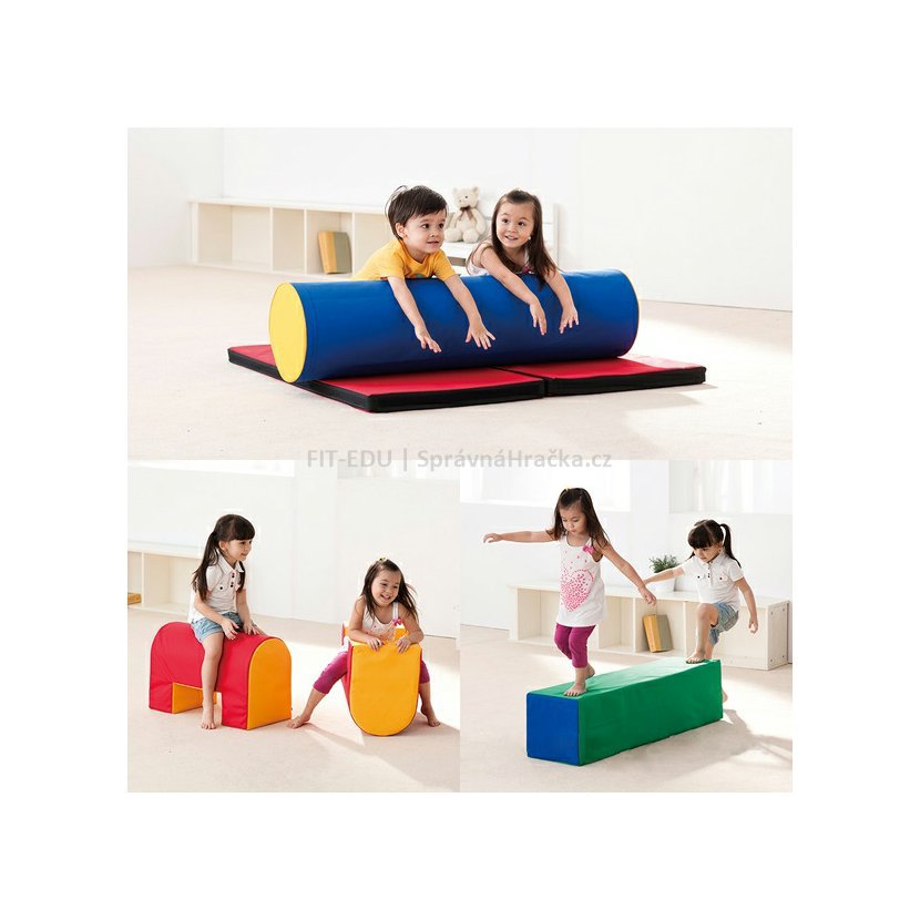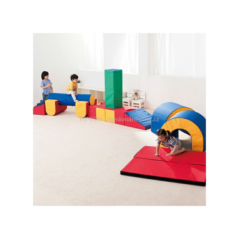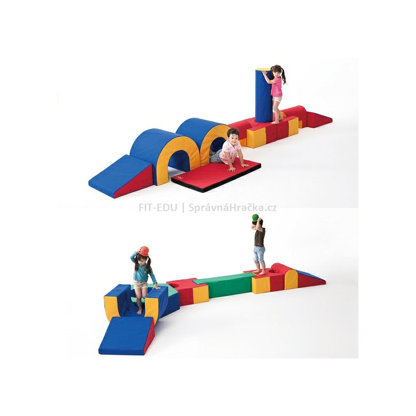 Obsah: 12 modulů - 2 x klínový modul 60 x 60 x 30 x 8 cm, 1 x kvádrový modul 30 x 30 x 120 cm, 2 x H-modul 60 x 60 x 30 cm, 2 x žíněnka 120 x 60 x 5 cm, 1 x válec Ø 30 cm, 2 x kůň o základně 30 x 60 a výšce 40 cm, 2 x mostovka o základně 80 x 60 cm a výšce 60 cm),