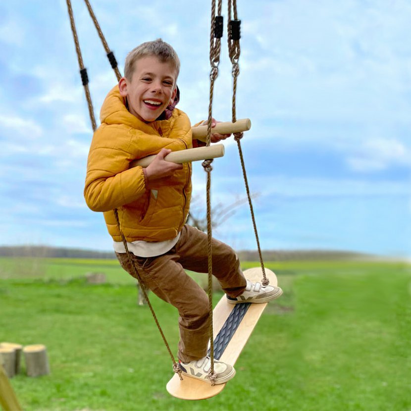 Houpejte se jako šampioni v netradičních sportech, na prkně připomínajícím skateboard! Děti na něm mohou nejen sedět, ale i stát jako na skutečném skateboardu! K ruce je jim přitom dvojice madel, jejichž výšku lze na laně snadno upravit. Součástí balení je také protiskluzová samolepka pro ještě větší jistotu při houpání ve stoje. Prkno je vyrobeno ze silné překližky a spolu s robustními madly z masivního dřeva je zavěšeno na vysoce odolných a poddajných nylonových lanech. Délku lan lze kdykoli snadno upravit pomocí kovových průvleků, na koncích jsou opatřena kovovými kroužky a bezpečnostními karabinami k zavěšení. Hlavní vlastnosti: madla a protiskluzová samolepka pro větší bezpečnostjednoduché nastavení délky lan a polohy madelnosnost 100 kgodolné provedení