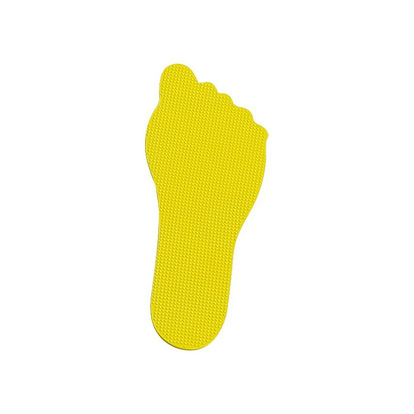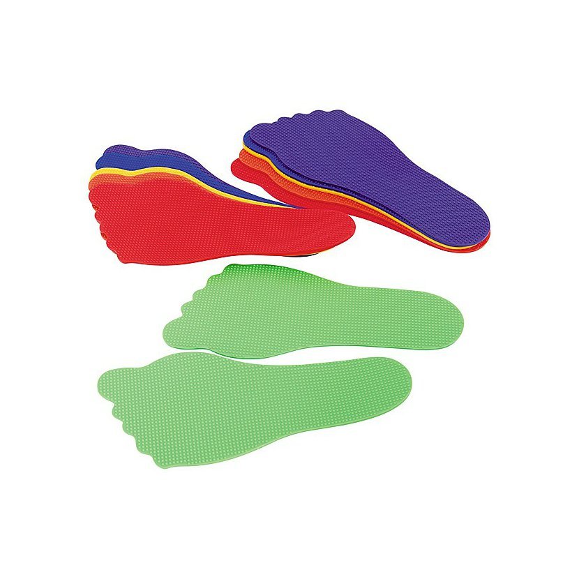 Barevné díly ve tvaru chodidel, vyrobené z gumy s drsným povrchem, vhodné pro cviky k aktivaci senzorických funkcí a pro sportovní hry.