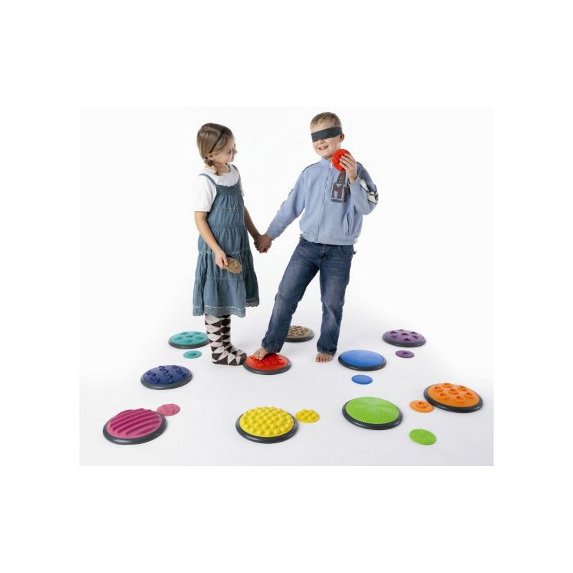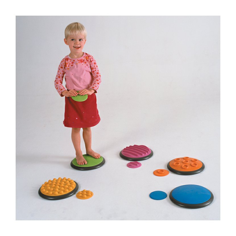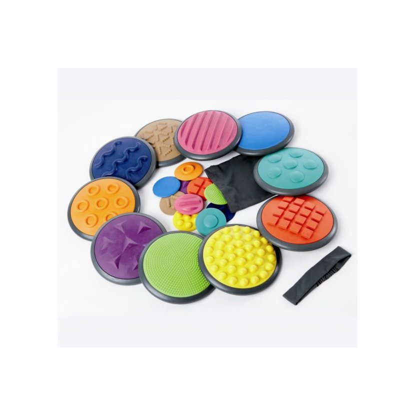 Taktilní disky jsou vyrobeny ze syntetické gumové hmoty a obsahují různé dotykové struktury, každou v jiné barvě. Každá z dotykových struktur může být nalezena na velkém disku, který se dá umístit na zem, ale také na malém disku který mohou děti držet v dlaních.