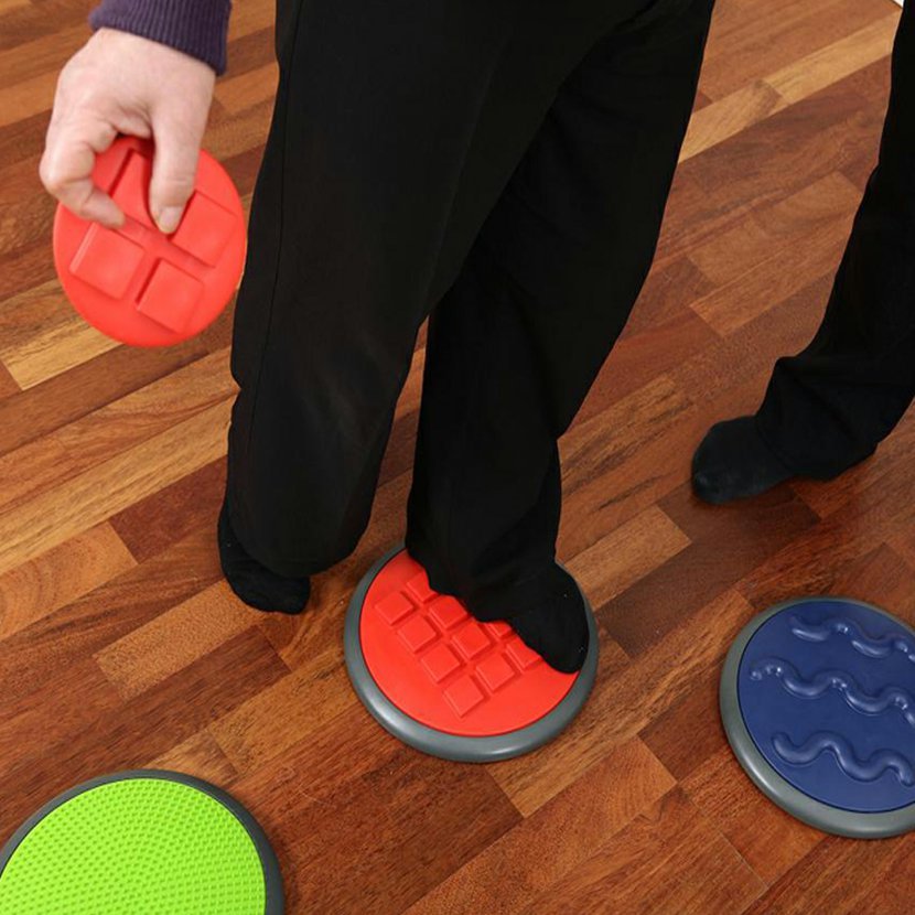 Taktilní disky jsou vyrobeny ze syntetické gumové hmoty a obsahují různé dotykové struktury, každou v jiné barvě. Každá z dotykových struktur může být nalezena na velkém disku, který se dá umístit na zem, ale také na malém disku který mohou děti držet v dlaních.