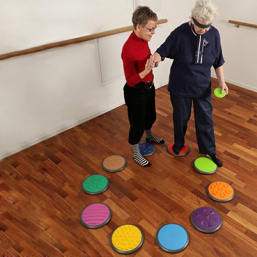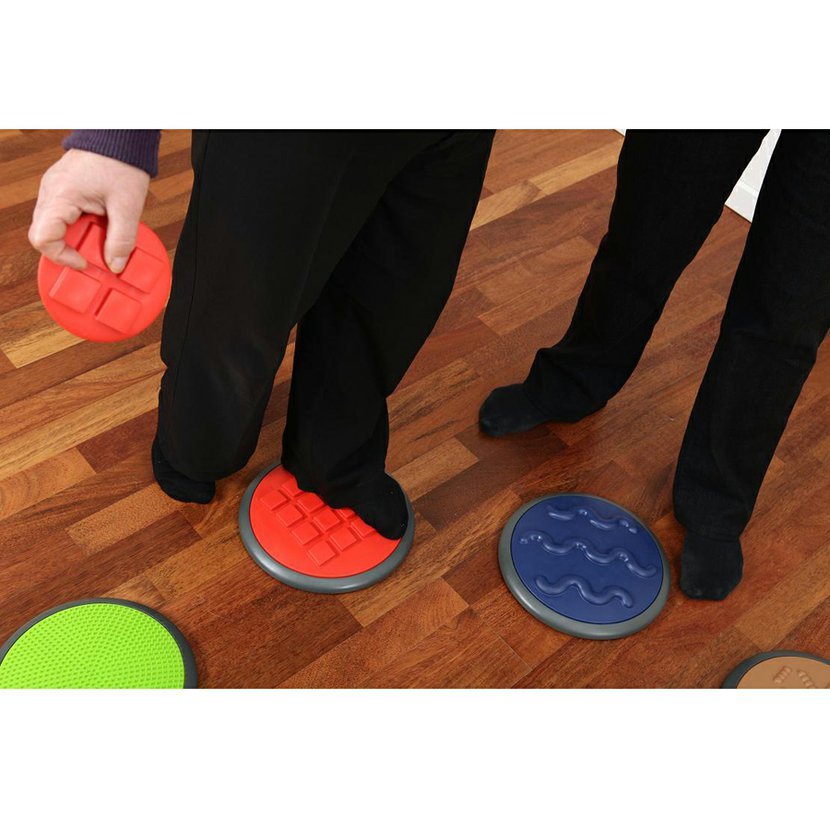 Taktilní disky jsou vyrobeny ze syntetické gumové hmoty a obsahují různé dotykové struktury, každou v jiné barvě. Každá z dotykových struktur může být nalezena na velkém disku, který se dá umístit na zem, ale také na malém disku který mohou děti držet v dlaních.