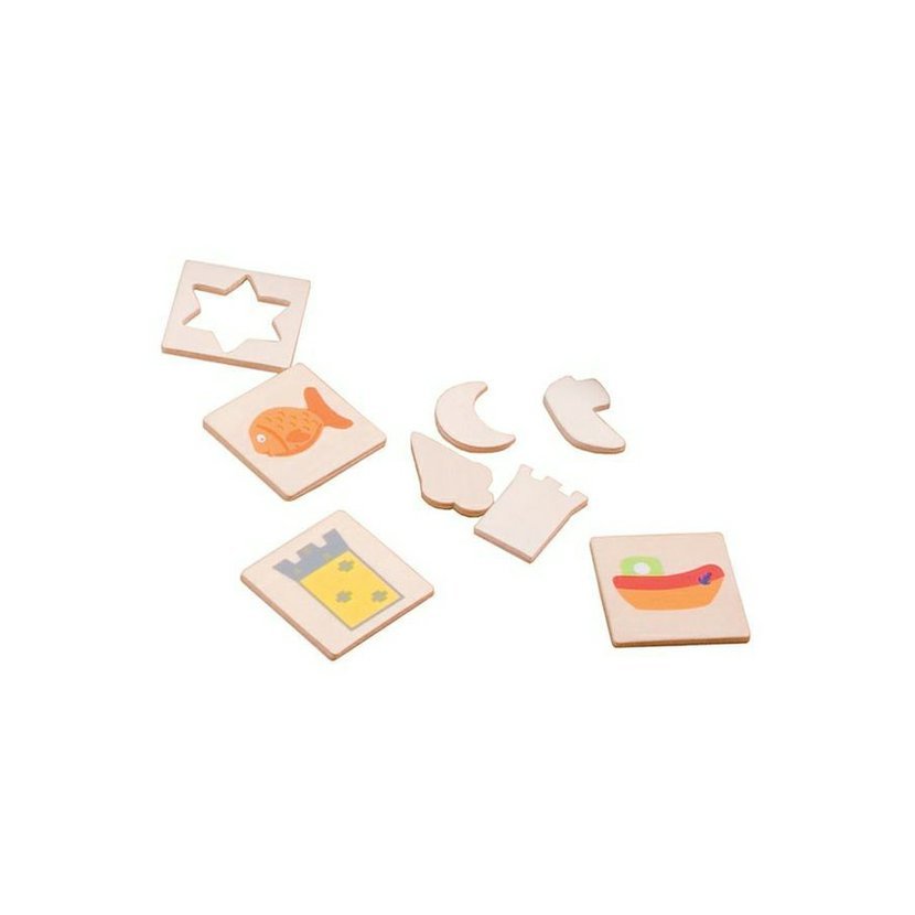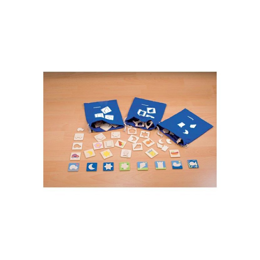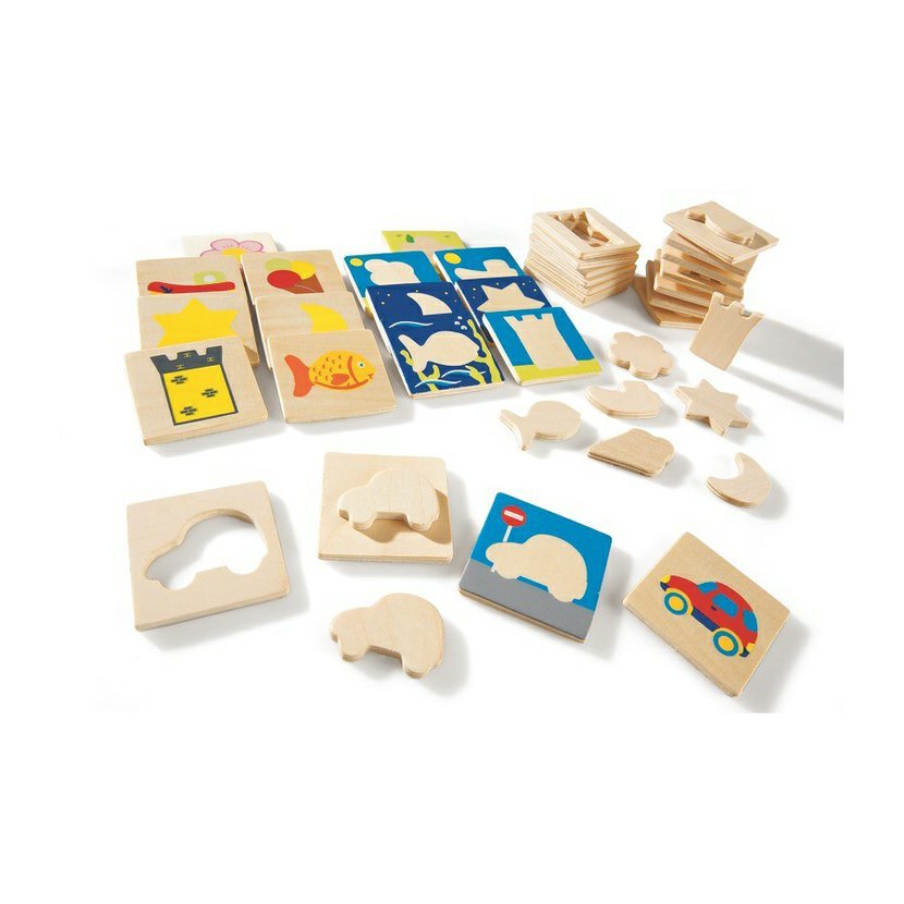 Tato didaktická přiřazovací hra obsahuje celkem 8 různých tvarů (auto, měsíc, hvězda, květina, loď, ryba atd.) v několika odlišných formátech - barevný tvar vytištěný na dřevěné destičce, bezbarvý tvar na destičce s barevným pozadím, tvar vyřezaný do destičky či na destičce připevněný a samostatné tvary.