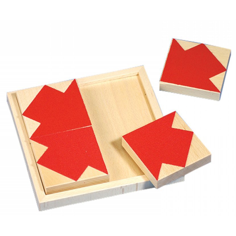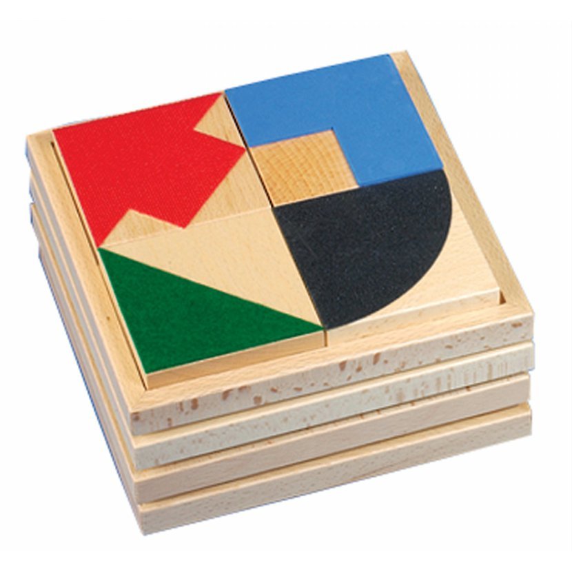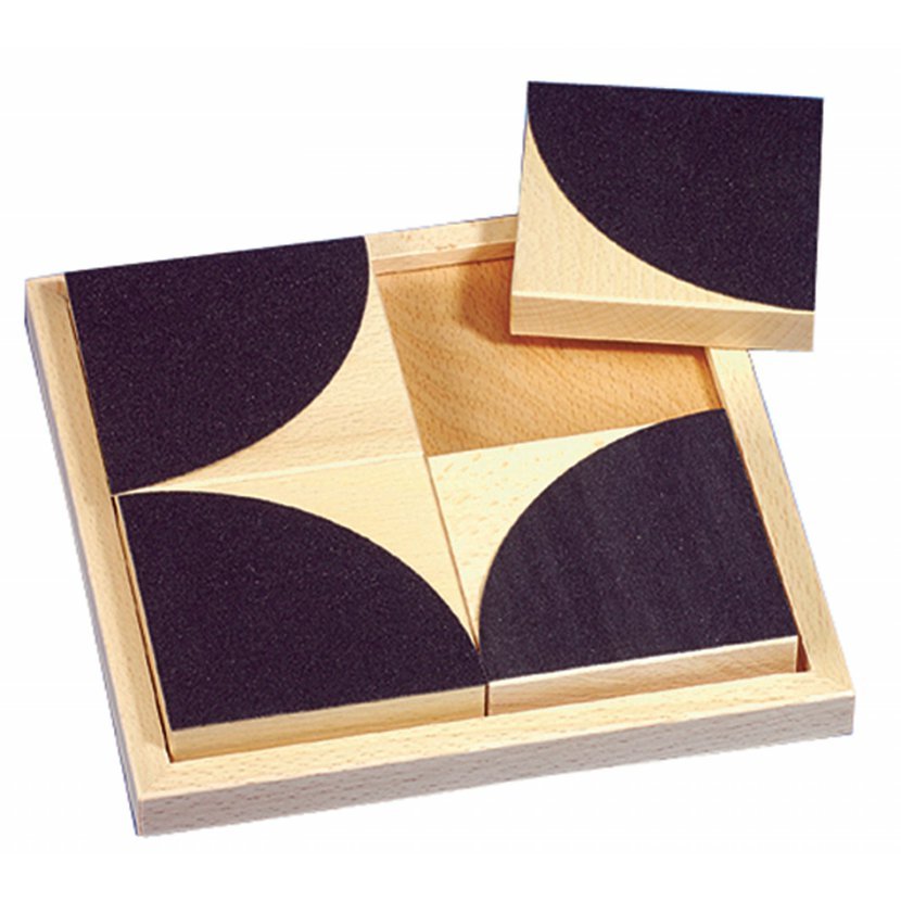 Jsou tady 4 materiály: drsný papír, velcro-suchý zip, plst a pěnová guma - každý z povrchů má různý geometrický tvar: čtvrtkruh,trojúhelník, šipka a úhel. Čtyři součásti z dubového dřeva, každá 8 x 8 cm, všechny dohromady v rámečku z dubového dřeva 18 cm x 18 cm. Každý rámeček je balen samostatně do silného kartonu. Jednotlivé rámečky mohou být postaveny na sebe. Obsahuje barevnou brožuru.