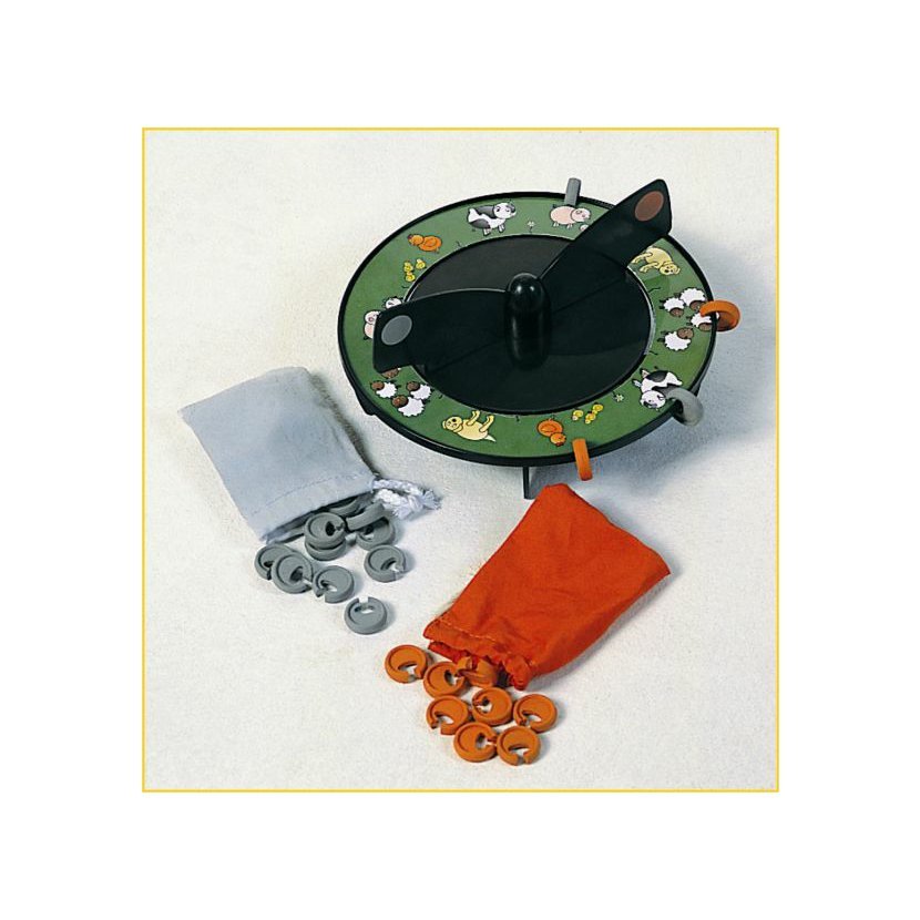 obsah: 1 box (220 x 220 x 100 mm), 1 hrací deska a vrtule z umělé hmoty, kruh s obrázky zvířat na obou stranách, 2 bavlněné sáčky, 10 šedivých a 10 oranžových hracích kroužků
