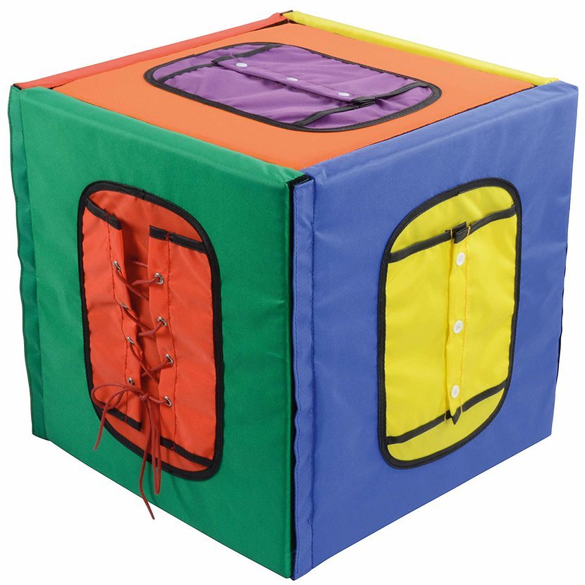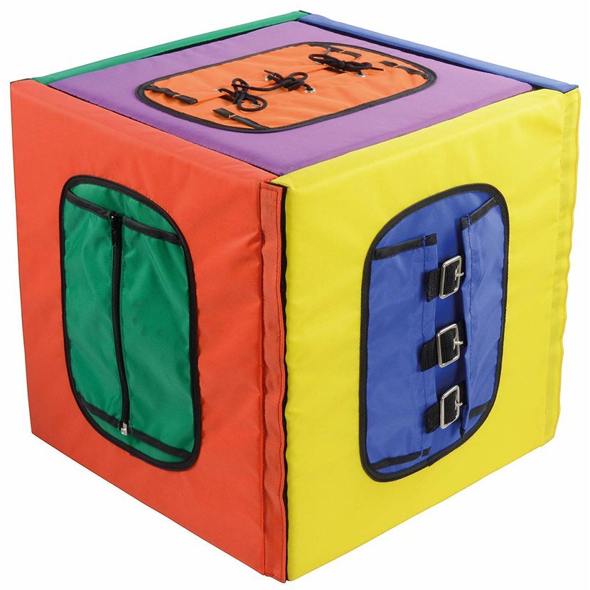 Zapnout košili, zapnout přezku na opasku, zip nebo knoflíky nebo dokonce zavázat tkaničku. To vše se naučí děti s touto barevnou měkkou kostkou.