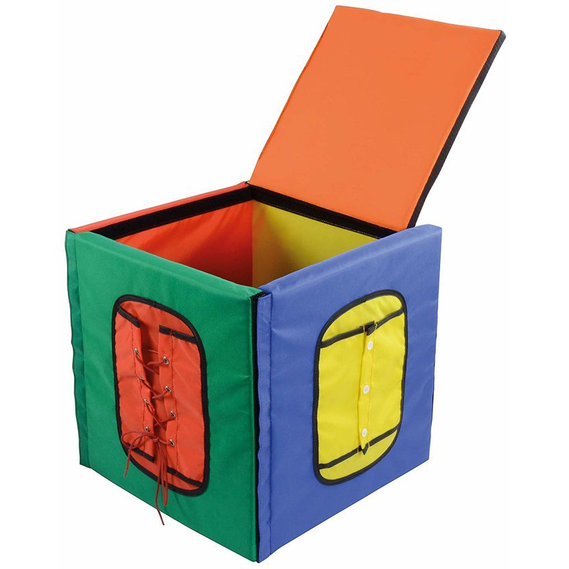6 různých způsobů zapínání mohou děti trénovat i jednotlivě na stole, neboť jsou ke kostce přichyceny jen suchým zipem. Kostku je možné využívat i jako odkládací box např. na drobné hračky.