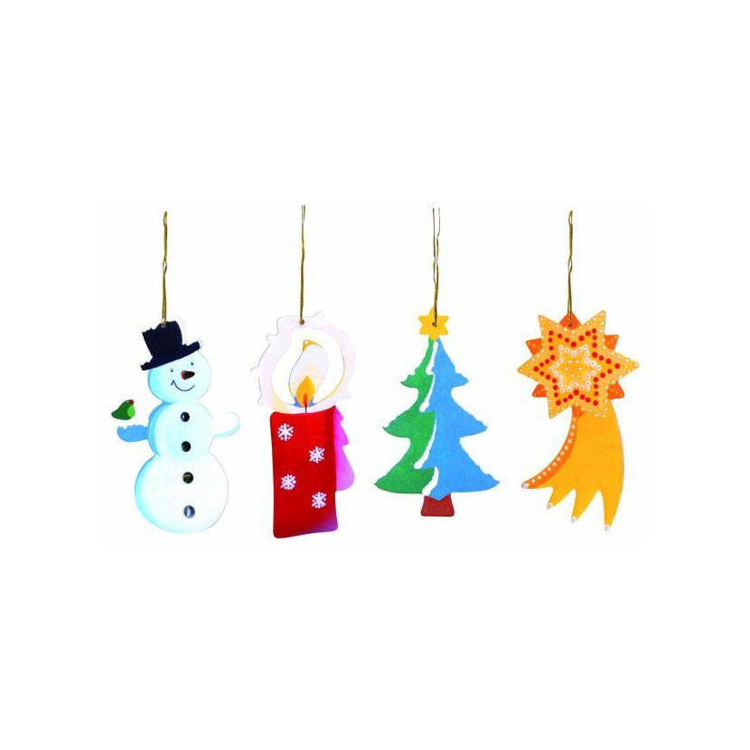 obsah: 4 ozdoby - sněhulák, svíčka, vánoční stromeček, vánoční hvězda, rozměr cca. 13 x 6 cm, materiál: překližka, věk: 3+