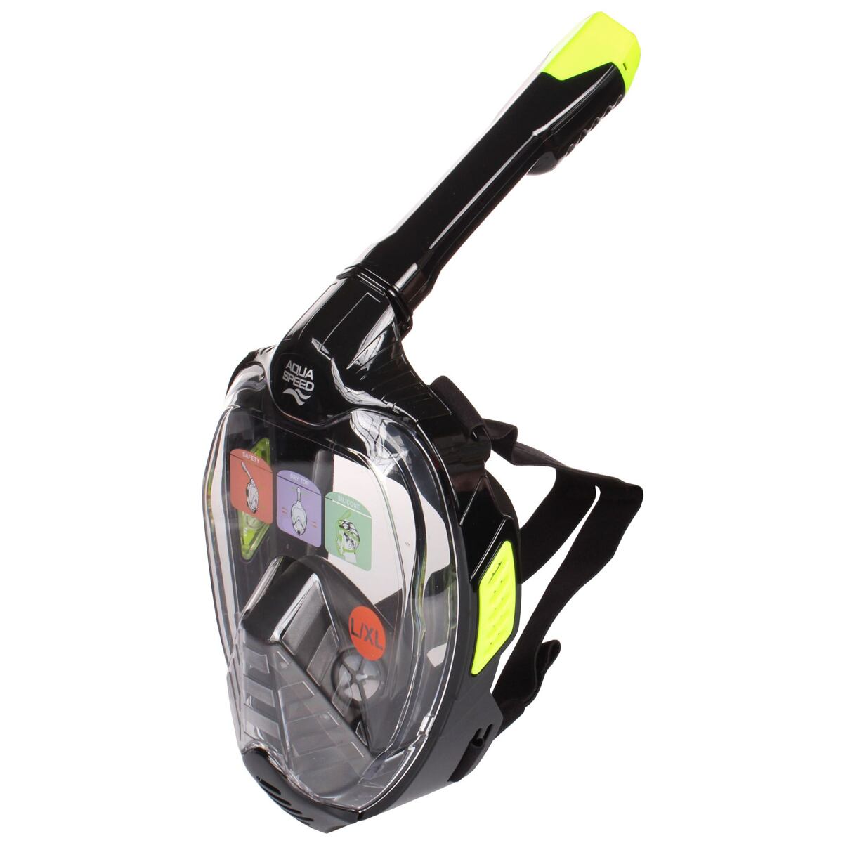 Potápěčská maska Aqua-Speed Veifa ZX nabízí zcela nový pohled na podvodní svět. Celoobličejová maska vám rozšíří obzory při šnorchlování nebo potápění v malých hloubkách (při sestupu do větších hloubek je nutné vyrovnávat tlak v uších, což není v celoobličejové masce z důvodu nedostatečného přístupu k nosu možné). Konstrukce masky je ale vhodná i pro ty potápěče, kteří považují tradiční potápěčské brýle a šnorchl za nepohodlné. Masku tvoří plastová konstrukce, jejíž součástí je těsnění z vysoce kvalitního silikonového kaučuku (LSR). Tvar masky a vlastnosti umožňují pohodlné přizpůsobení mnoha velikostem i tvarům obličeje. K přesnému usazení slouží dva délkově nastavitelné elastické pásky. Nezkreslený výhled zajišťuje konstrukce s minimálním vnitřním objemem a proti slunečnímu svitu mírně zabarvený visor z vysoce kvalitního odolného polykarbonátu. Šnorchl lze snadno složit, což umožňuje snazší přepravu i uskladnění. Součástí masky je i držák pro kameru (kamera není součástí balení). Jak zvolit správnou velikost potápěčské masky Aqua-Speed? Tento model je k dispozici ve dvou velikostech. Pokud nemáte možnost vyzkoušet si masku před zakoupením, použijte následující metodu k měření velikosti obličeje: Zavřete ústa a změřte vzdálenost mezi okrajem brady a obočím. Je-li vzdálenost menší než 14 cm, zvolte velikost S/M. Je-li vzdálenost větší, zvolte velikost L/XL.