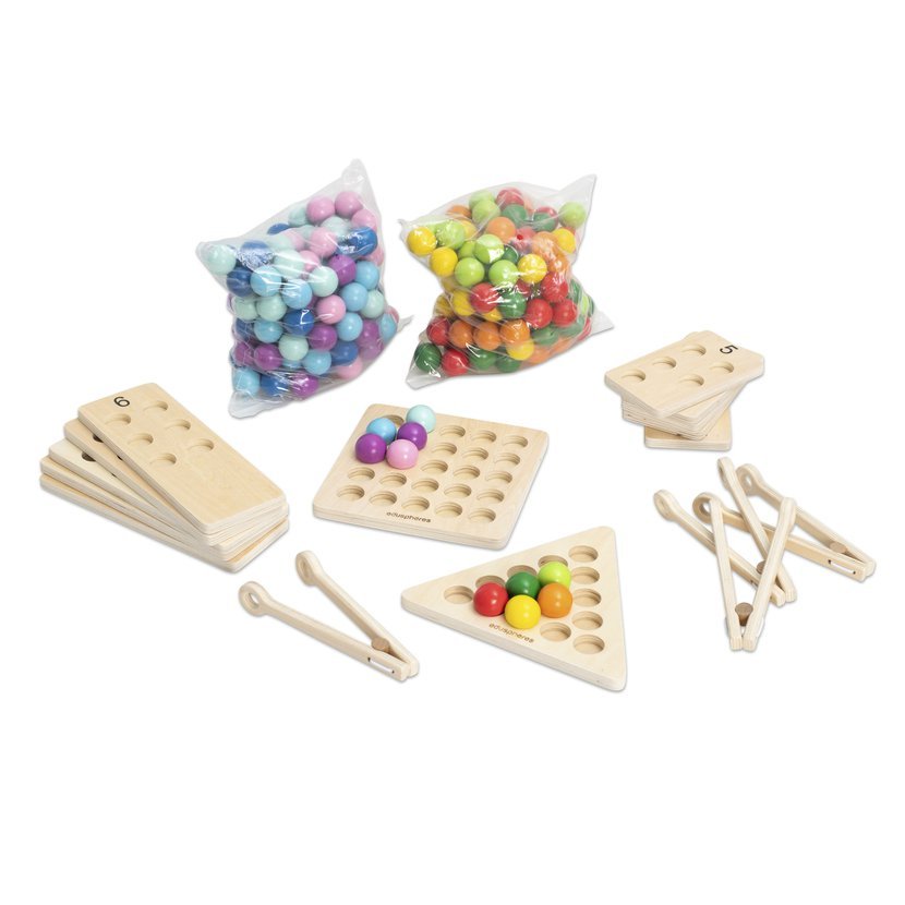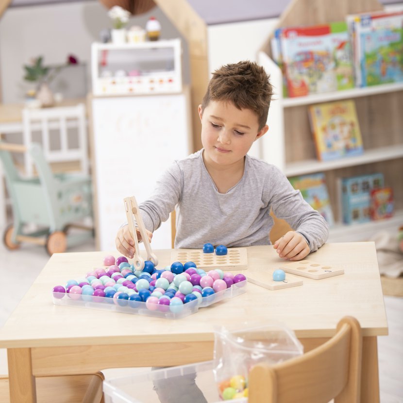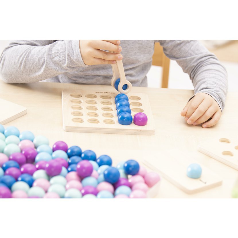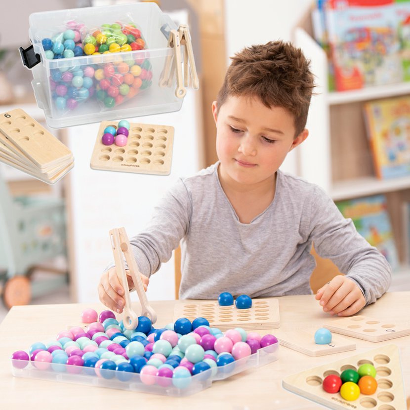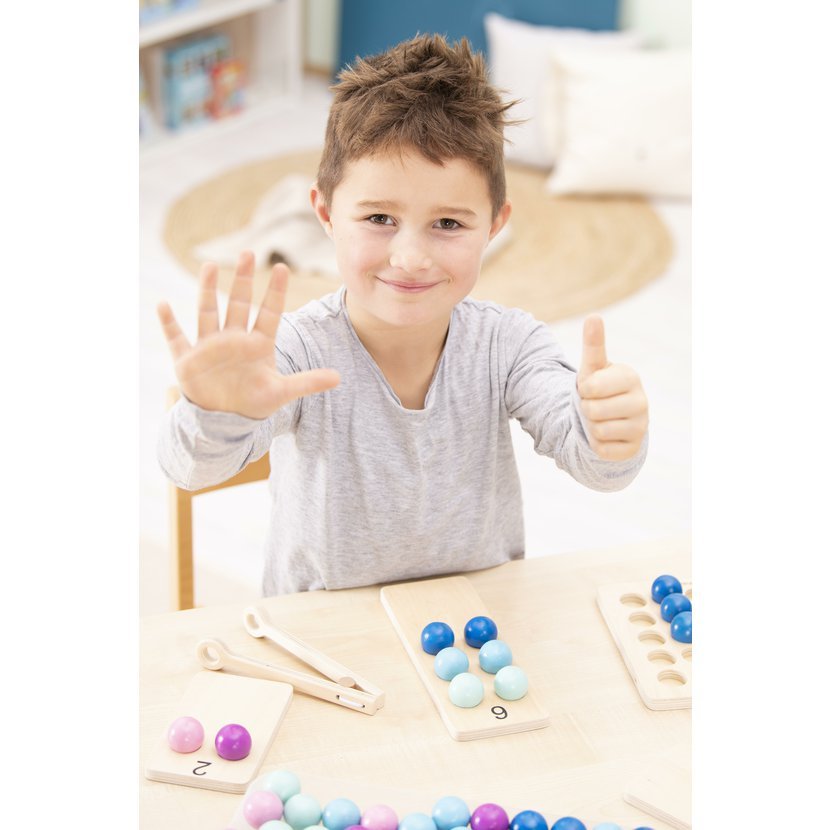 Děti od 3 let intenzivně trénují jemnou motoriku při uchopování míčků dřevěnou pinzetou. Kuličky umístíte na příslušné počítací desky. To podporuje jejich porozumění číslům v rozsahu čísel do 10. Děti se hravou formou učí čísla a počítání. Z barevných dřevěných kuliček lze vytvořit i pyramidu nebo čtverec. Kuličky v 10 barvách zvou k třídění a seskupování. Mohou povzbudit děti, aby hrály úplně nové hry. Pouze vaše představivost je limit.