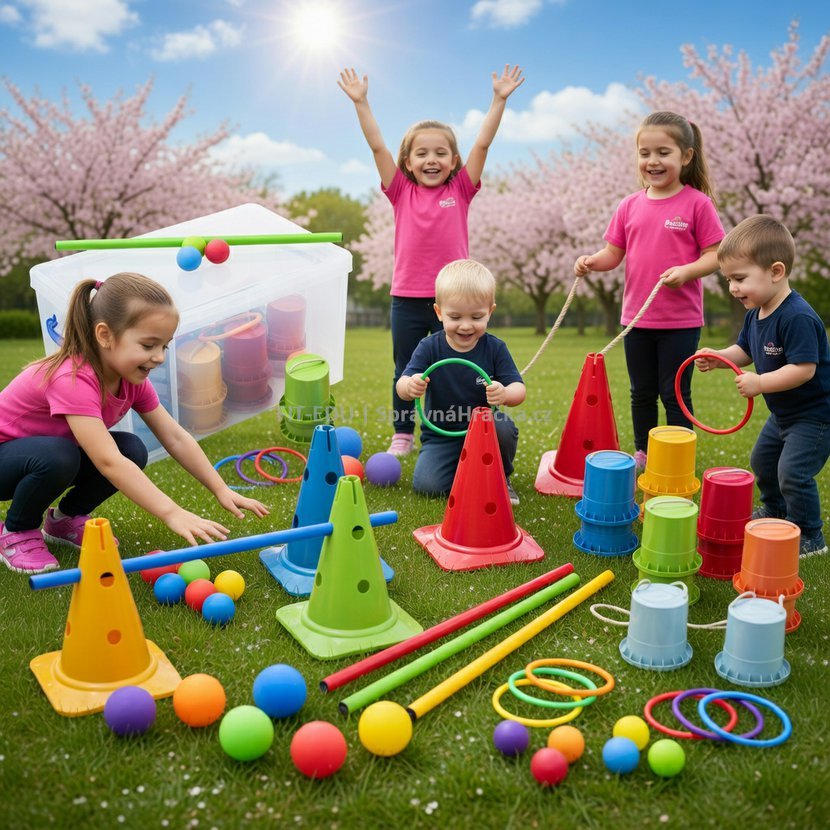 Víceúčelová startovací sada pro rozvoj motoriky dětí umožňuje stavbu překážkové dráhy uvnitř i venku a rozvíjí rovnováhu, koordinaci i pohybové dovednosti.