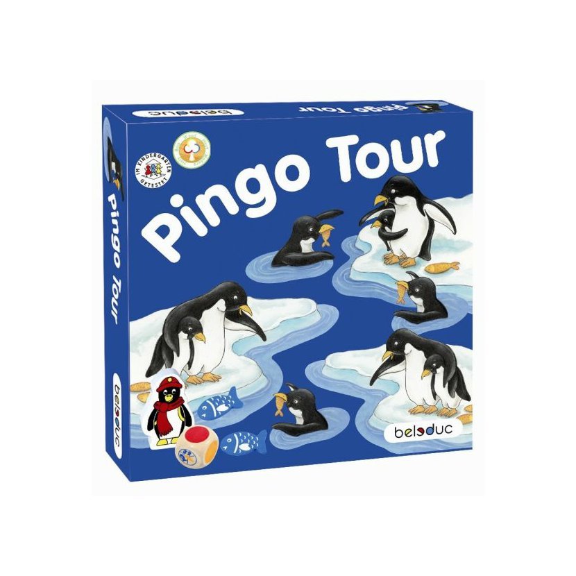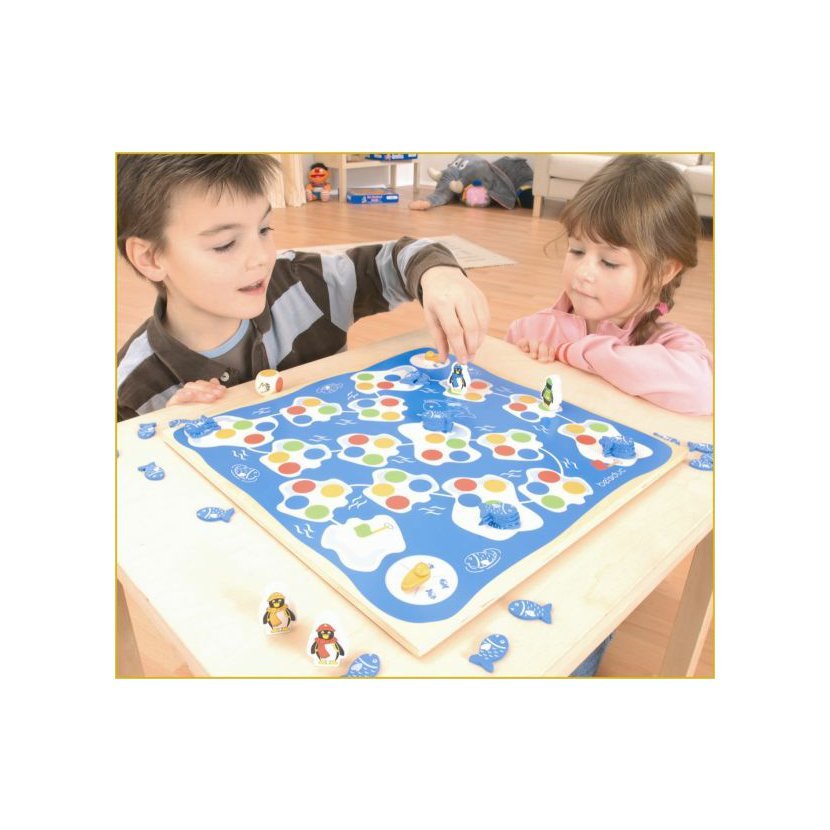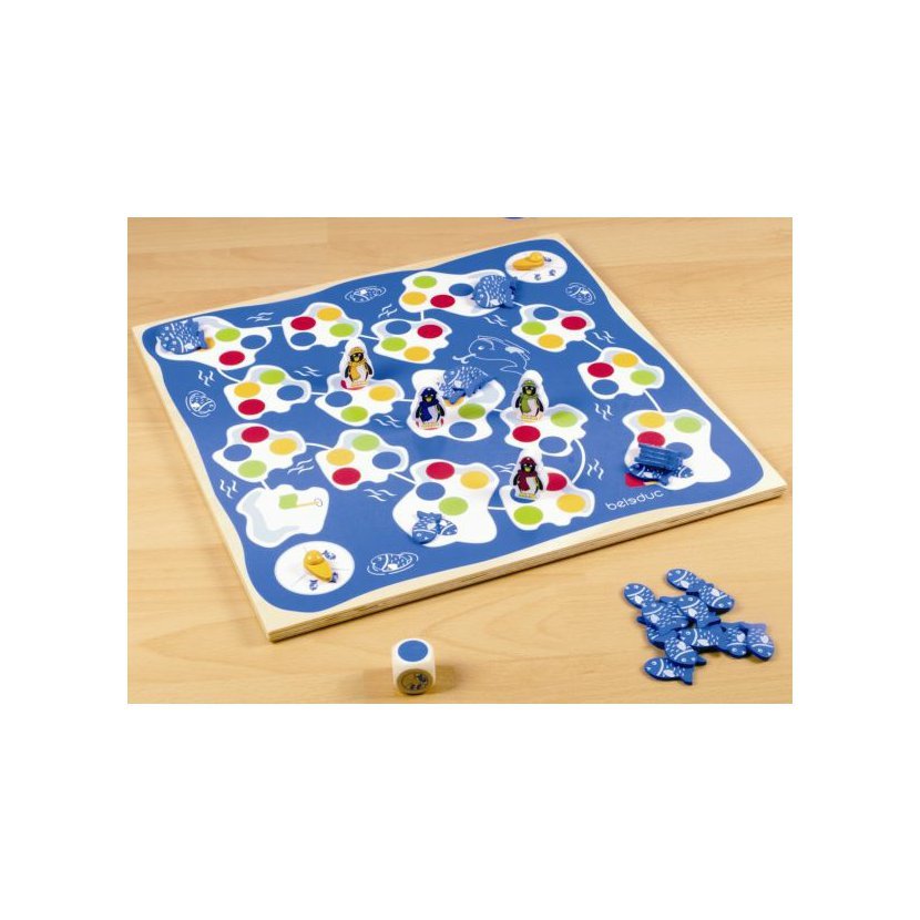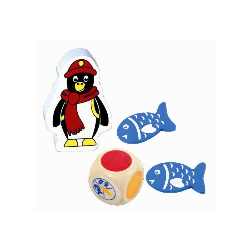 - obsah: 1 x dřevěná hrací deska (370 x 370 x 10 mm), 4 x figurka tučňáka, 40 x rybka, 1 x hrací kostka s barvami a symboly