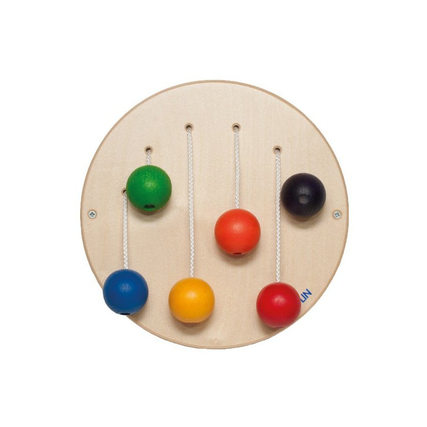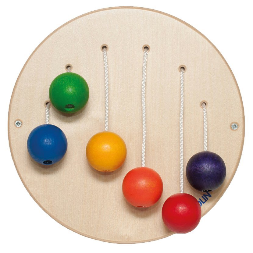 Šest svítivě barevných dřevěných kuliček vybízí k uchopování a pouštění.