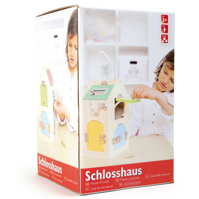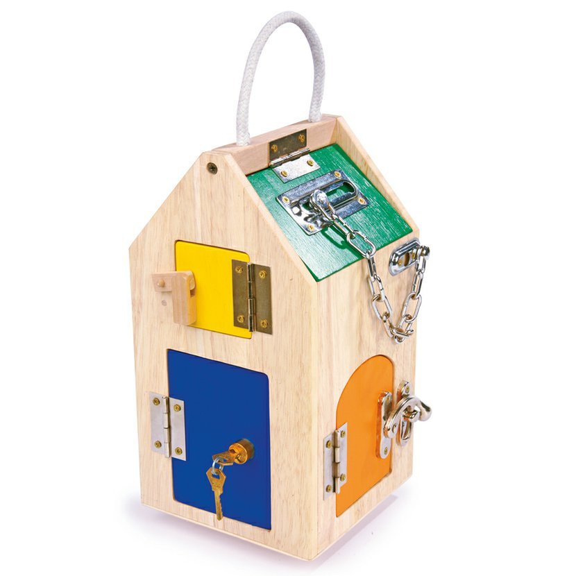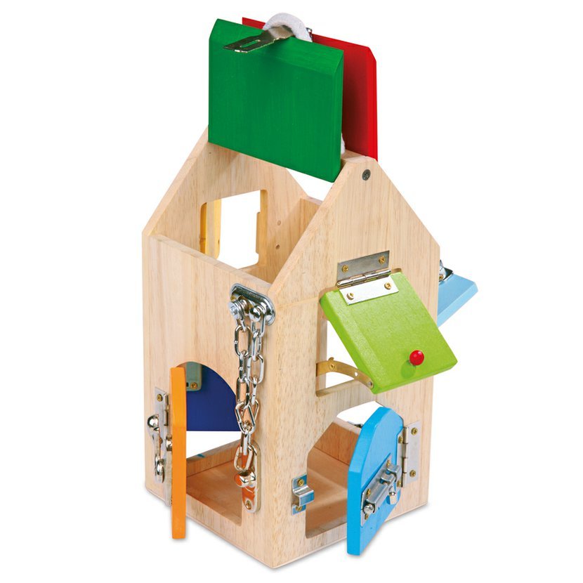 Bezvadná pomůcka pro každodenní procvičování manuální zručnosti. Děti se v tomto dřevěném domě seznámí s různými zámky, několika závorami, pákami a s bezpečnostním řetězem. Jen je potřeba být obezřetný, jelikož od této chvíle již nebudou žádné zavřené dveře pro dítě problém!