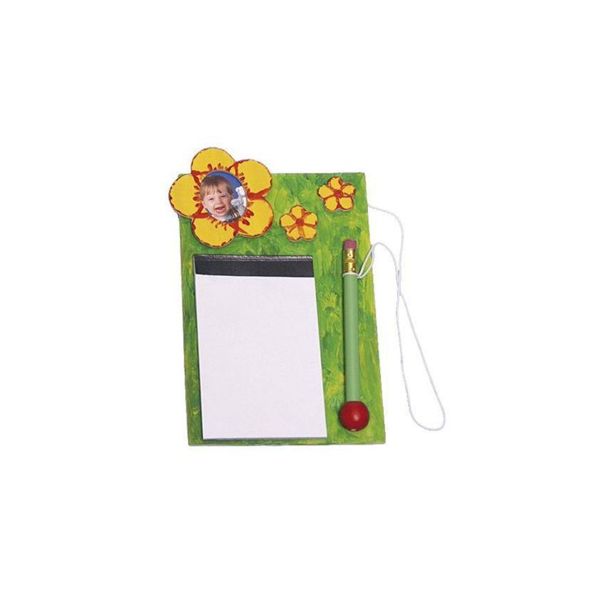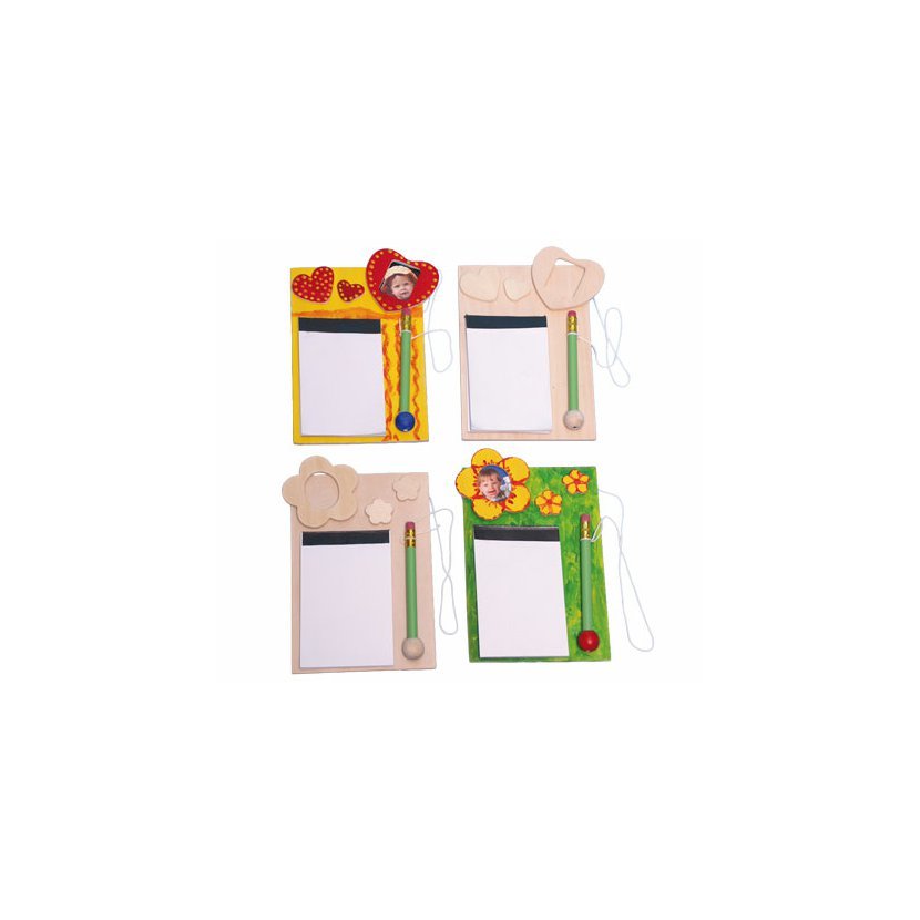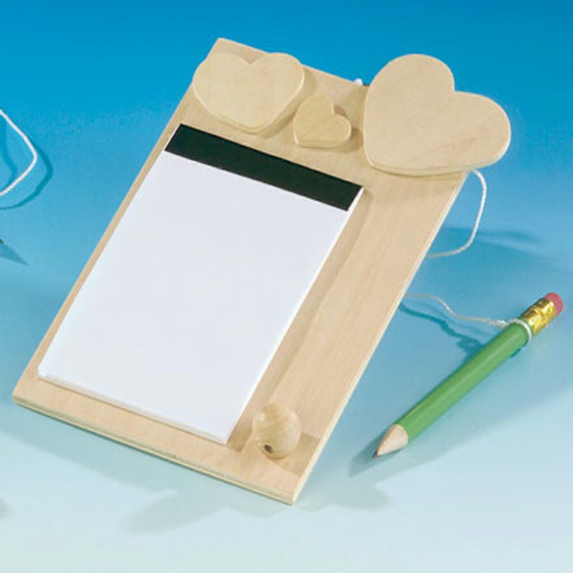 Poznámkový blok je vyroben z nelakovaného dřeva a lze jej libovolně ozdobit. Výrobek je dostupný ve dvou různých motivech (květina nebo srdce).