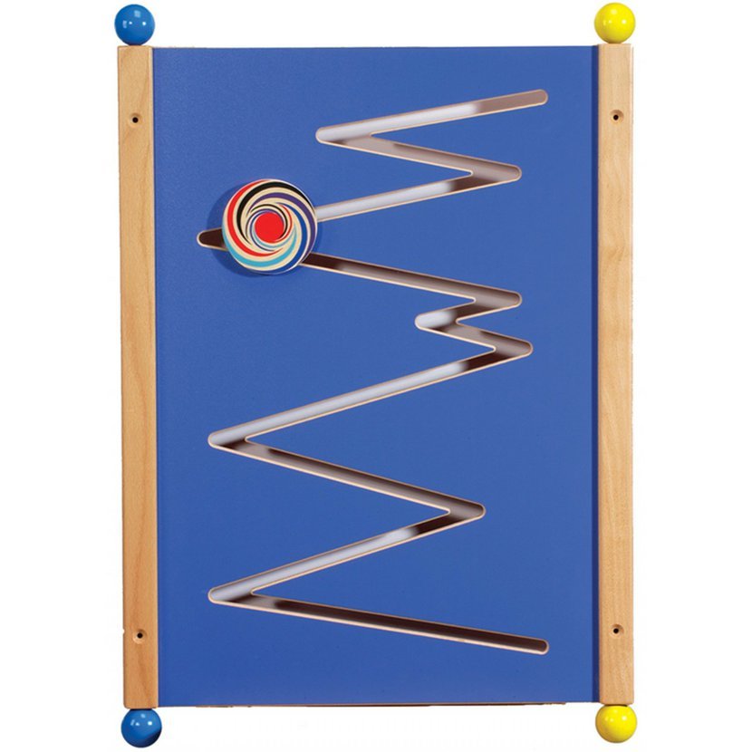 Na modré hrací desce se otáčí barevná spirála kolem rozsáhlé klikaté cesty a vytváří tak zajímavou vizuální podívanou se zvukovými efekty.