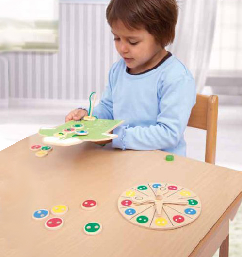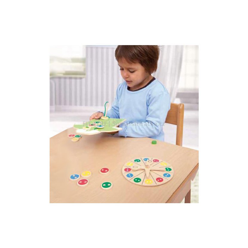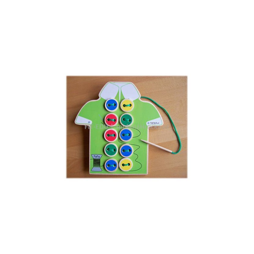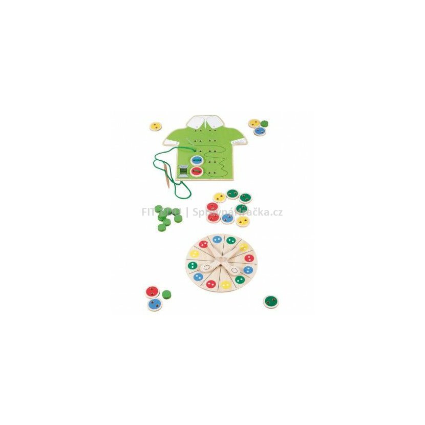S jehlou a nití, nůžkami a knoflíky jsou děti jako opravdoví výrobci oblečení. Trocha štěstí a zručnosti napomůže k tomu, aby byly všechny barevné knoflíky na košili rychle přišity. Rozvoj zručnosti, pozornosti a jemné motoriky. Rozeznávání barev.