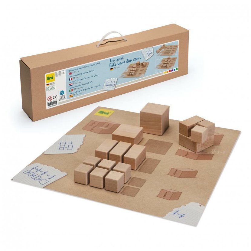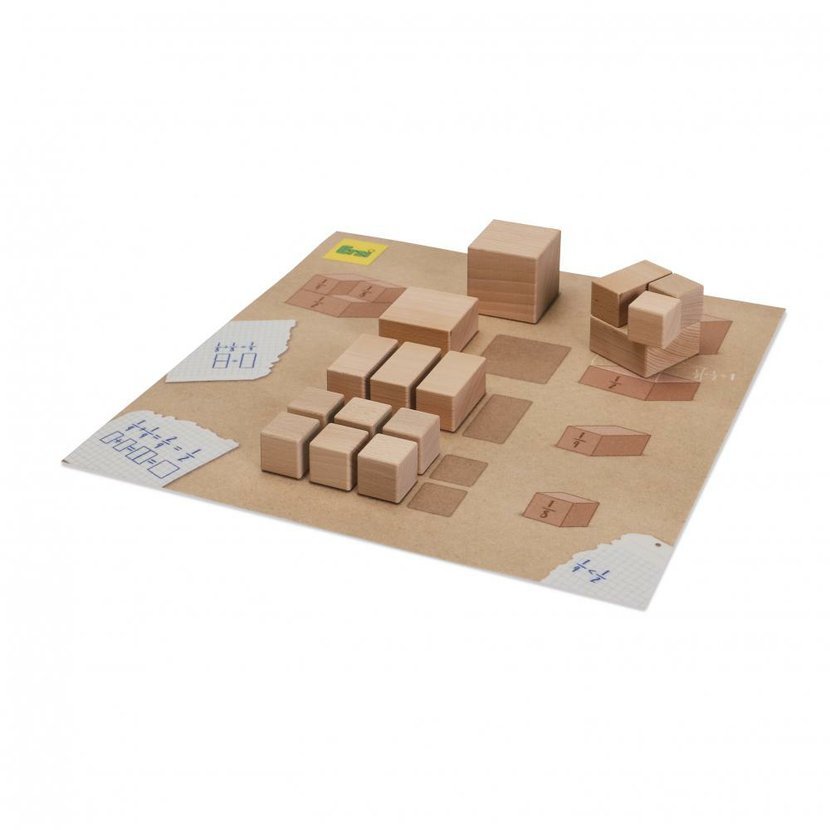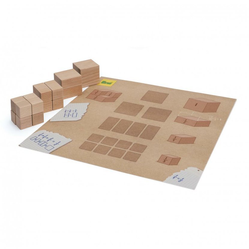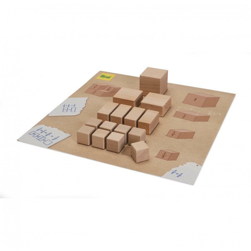 Didaktická hra z masivního bukového dřeva, která pomáhá dětem přiblížit téma dělení a zlomky. Menší děti se hrou s trojrozměrnými tělesy učí pochopit celek např. rozdělením do půlek nebo čtvrtek. S pomocí těchto kostek se starší děti mohou lépe učit a chápat jednoduché zlomky.
