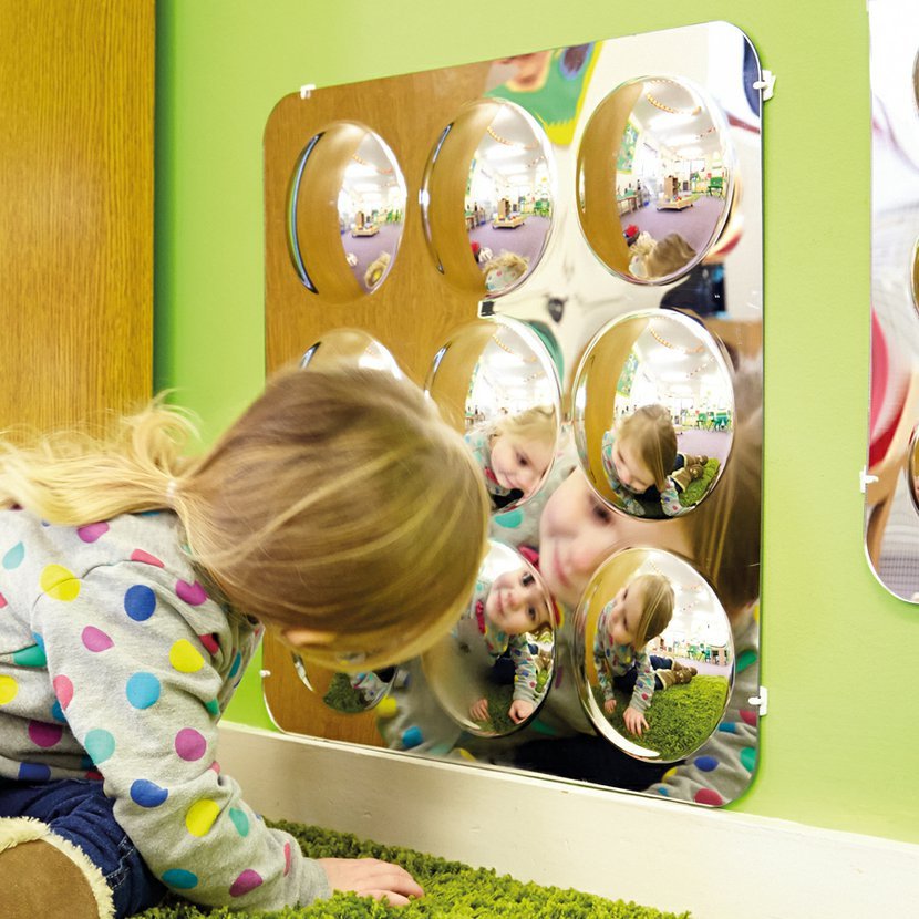 Vypouklá klenba u konvexních zrcadel znázorňuje v zrcadle zakřivený obraz. Pro děti velmi zábavné při objevování samy sebe a okolí.