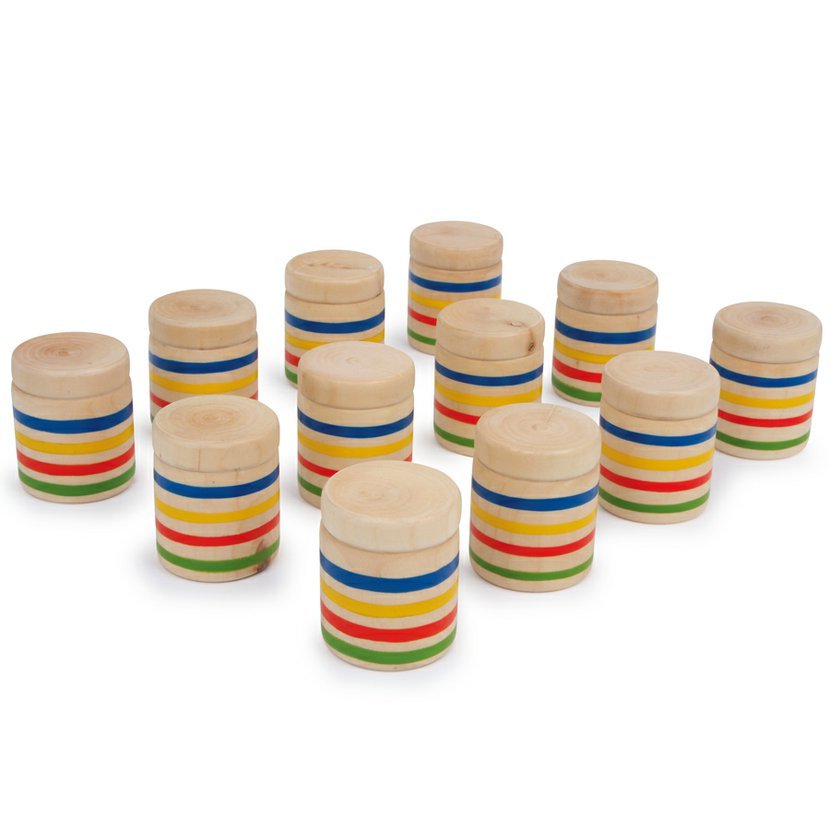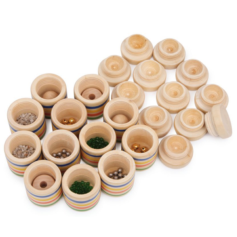 Pokuste se najít dva shodné zvuky! Poznáte při zatřepání rozdíl ve zvuku, který vydávají dřevěný kroužek, dřevěné kuličky, rýže, zvonečky, skleněné kuličky nebo malé oblázky? 6 párů dřevěných boxů se šroubovacím uzávěrem prověří vaši schopnost zapamatovat si zvuk.