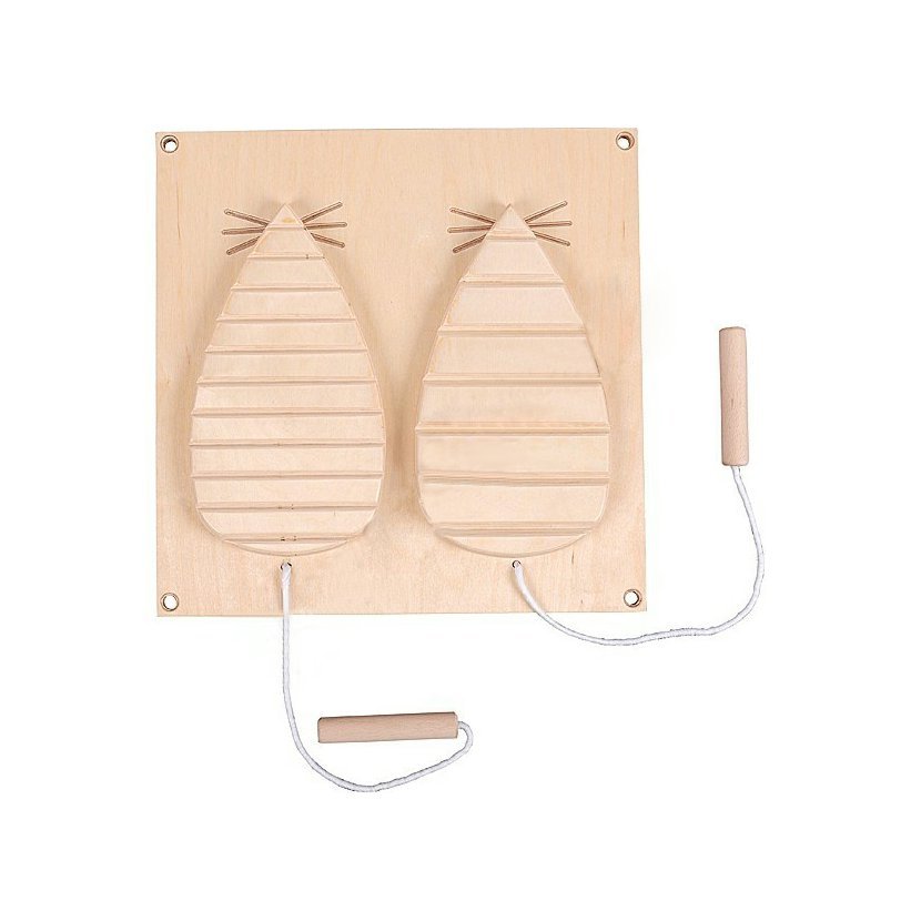 Myšky s vyfrézovanými motivy pro obtahování dřevěnými kolíky upevněnými na provázku.